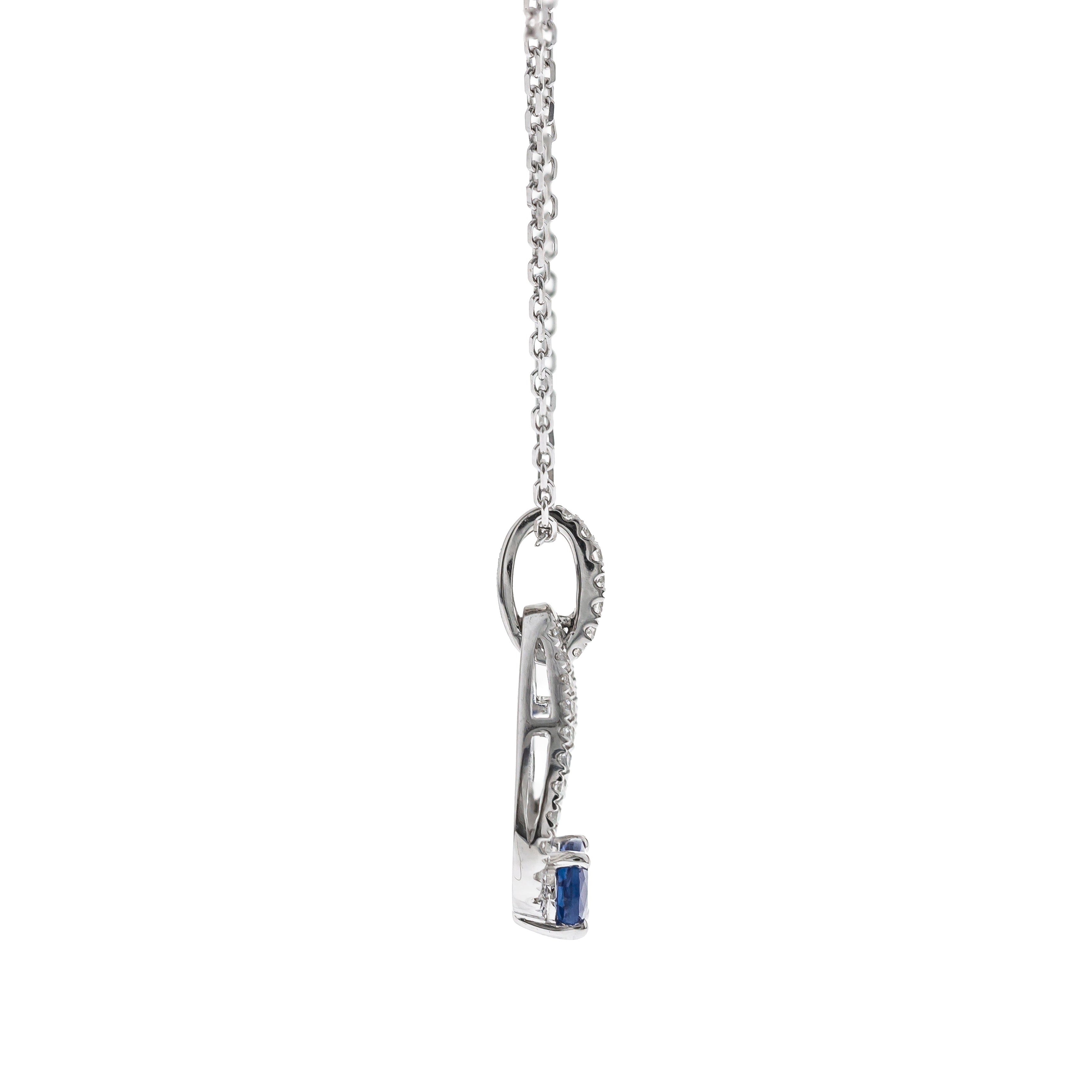 Decorate yourself in elegance with this Pendant is crafted from 10-karat White Gold by Gin & Grace. This Pendant is made up of Oval-Cut Blue Sapphire (1 pcs) 0.59 carat and Round-cut White Diamond (29 Pcs) 0.14 Carat. This Pendant is weight 0.65 grams. This delicate Pendant is polished to a high finish shine.