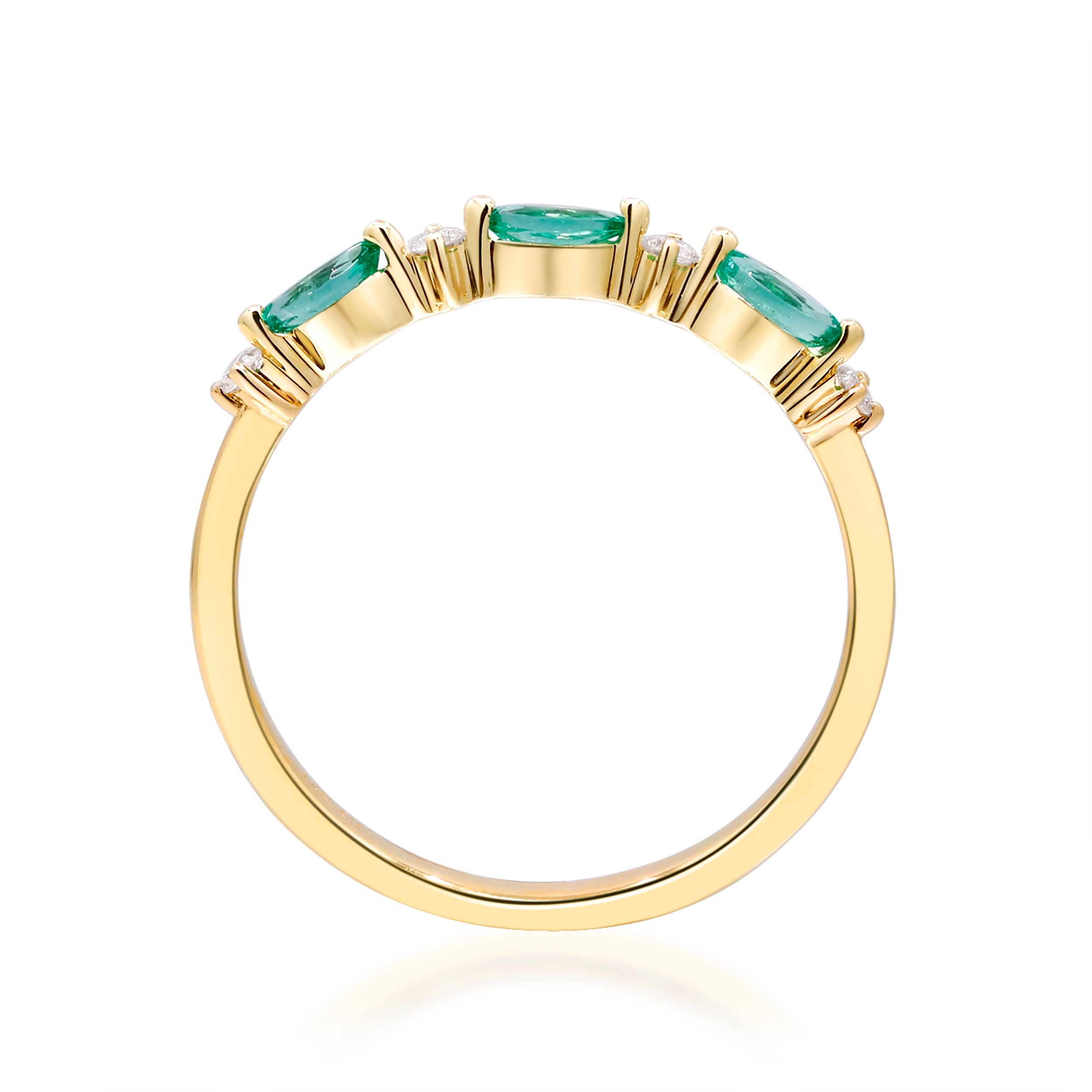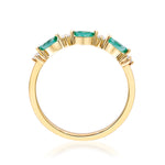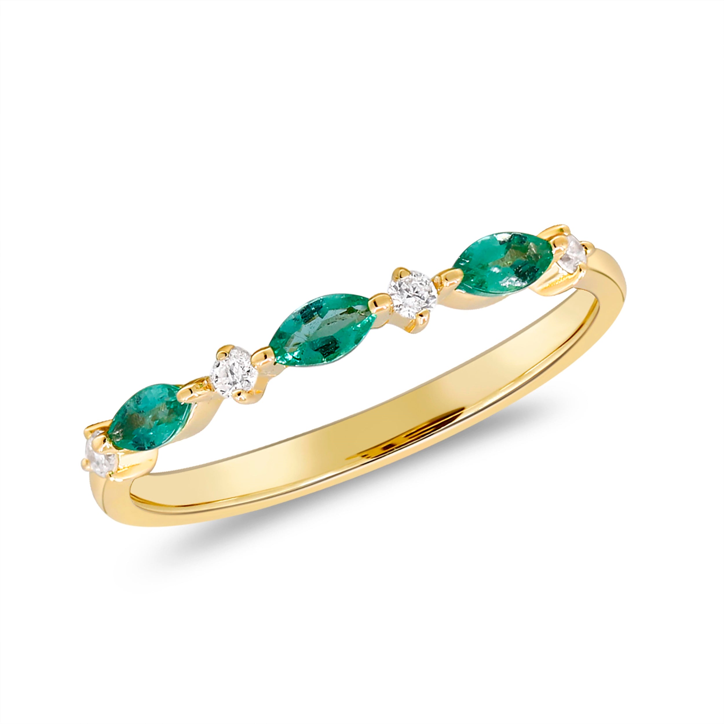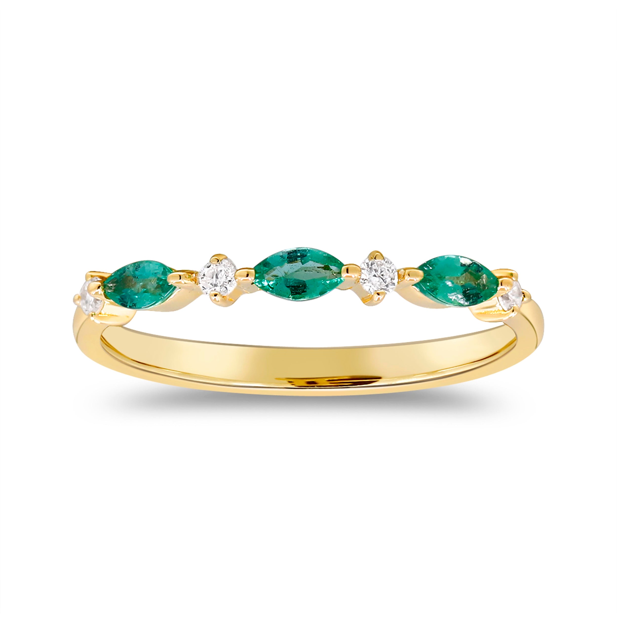 Elevate your style with the exquisite beauty of this Gin & Grace Ring, meticulously crafted from 14-karat Yellow Gold. This captivating piece features a trio of 2x4 mm Marquise-Cut Zambian Emerald gemstones, totaling 0.20 carats, and is accentuated by the brilliance of four Round-cut White Diamonds, weighing 0.07 carats.