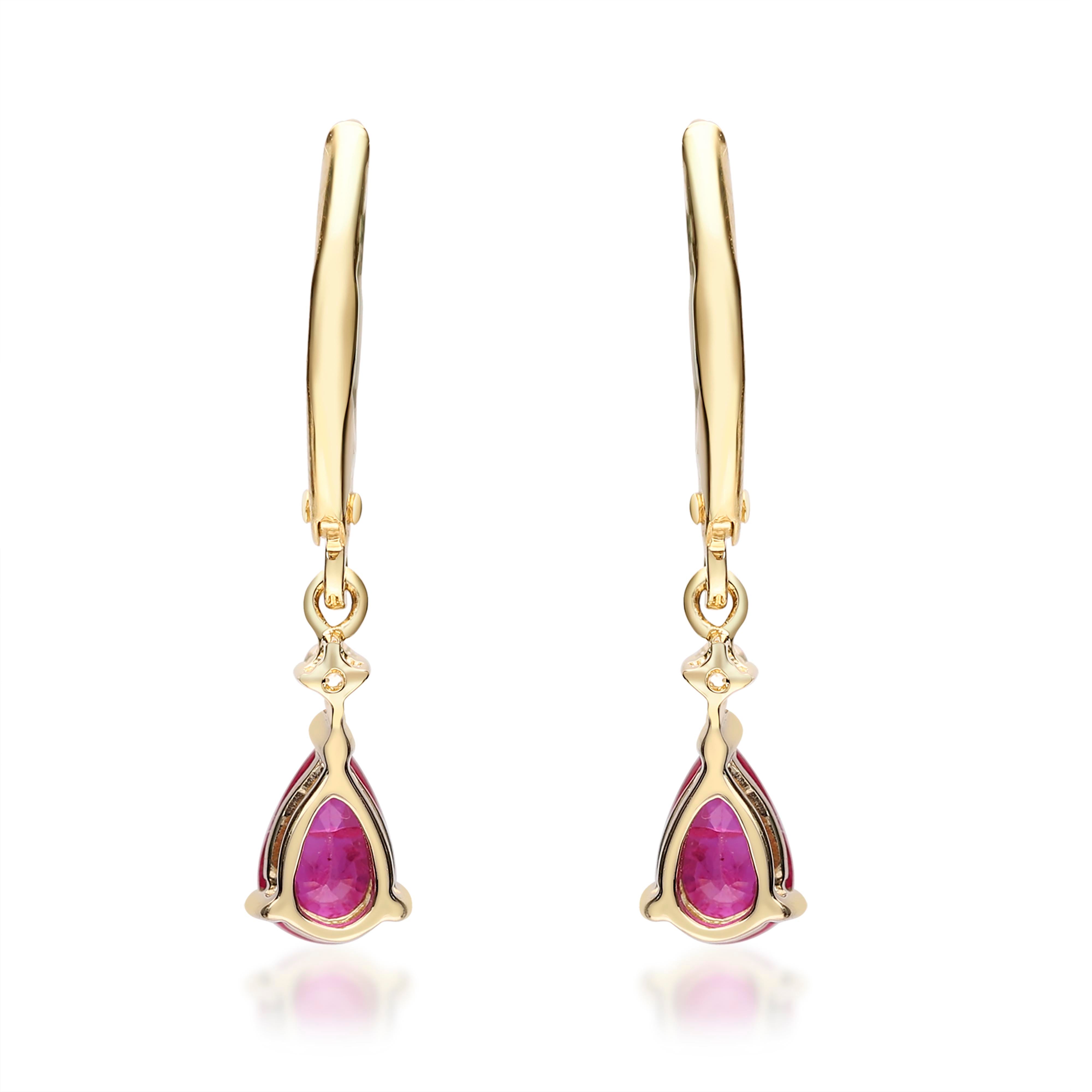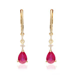 Decorate yourself in elegance with this Earring is crafted from 14-karat Yellow Gold by Gin & Grace Earring. The jewelry boasts Pear-Cut prong setting Mozambique Ruby (2 pcs) 0.86 Carat and Round-Cut prong setting Diamond (2 pcs) 0.03 Carat. This Earring is weight 1.15 grams. This delicate Earring is polished to a high finish shine. Simple lever back clasps keep these earrings securely fastened.