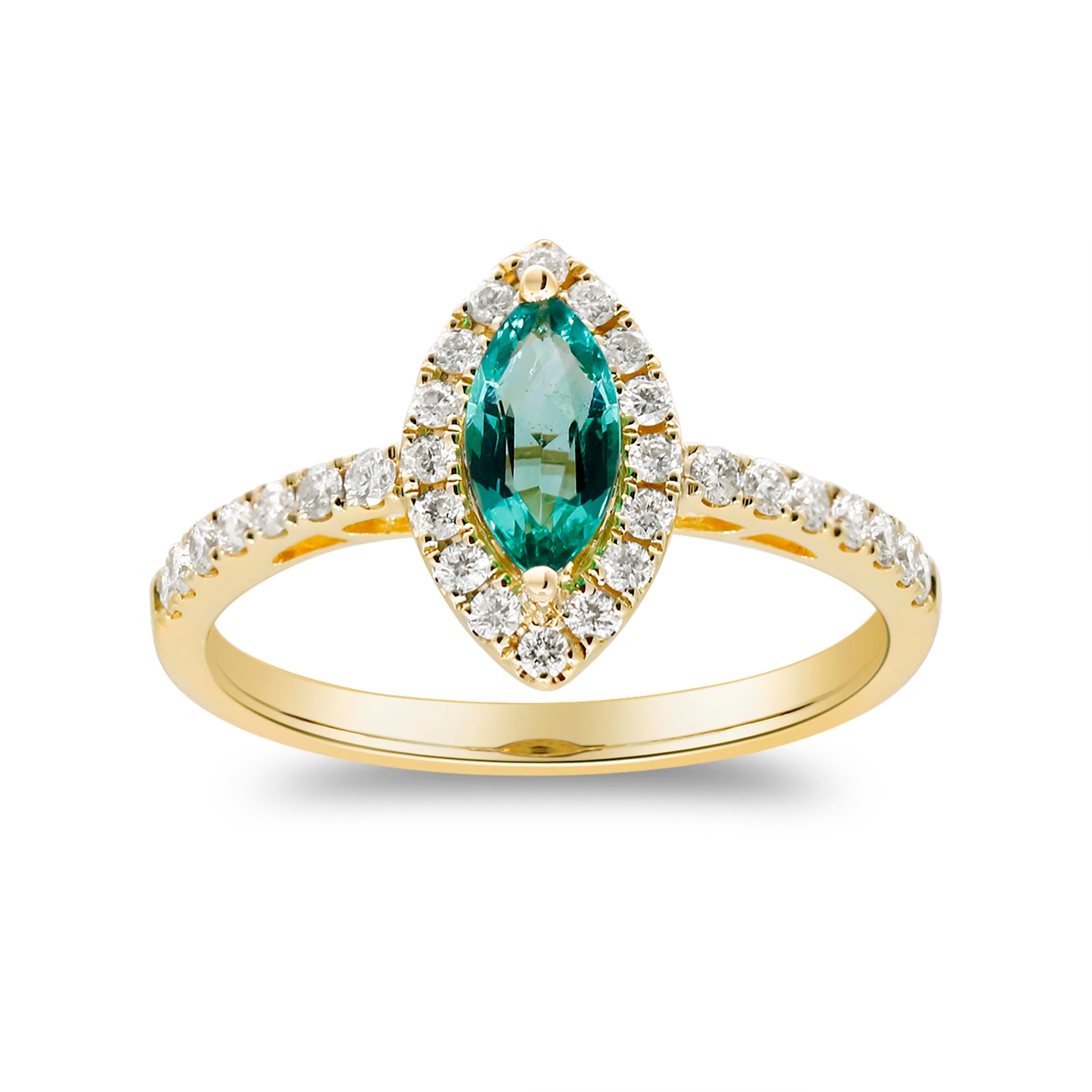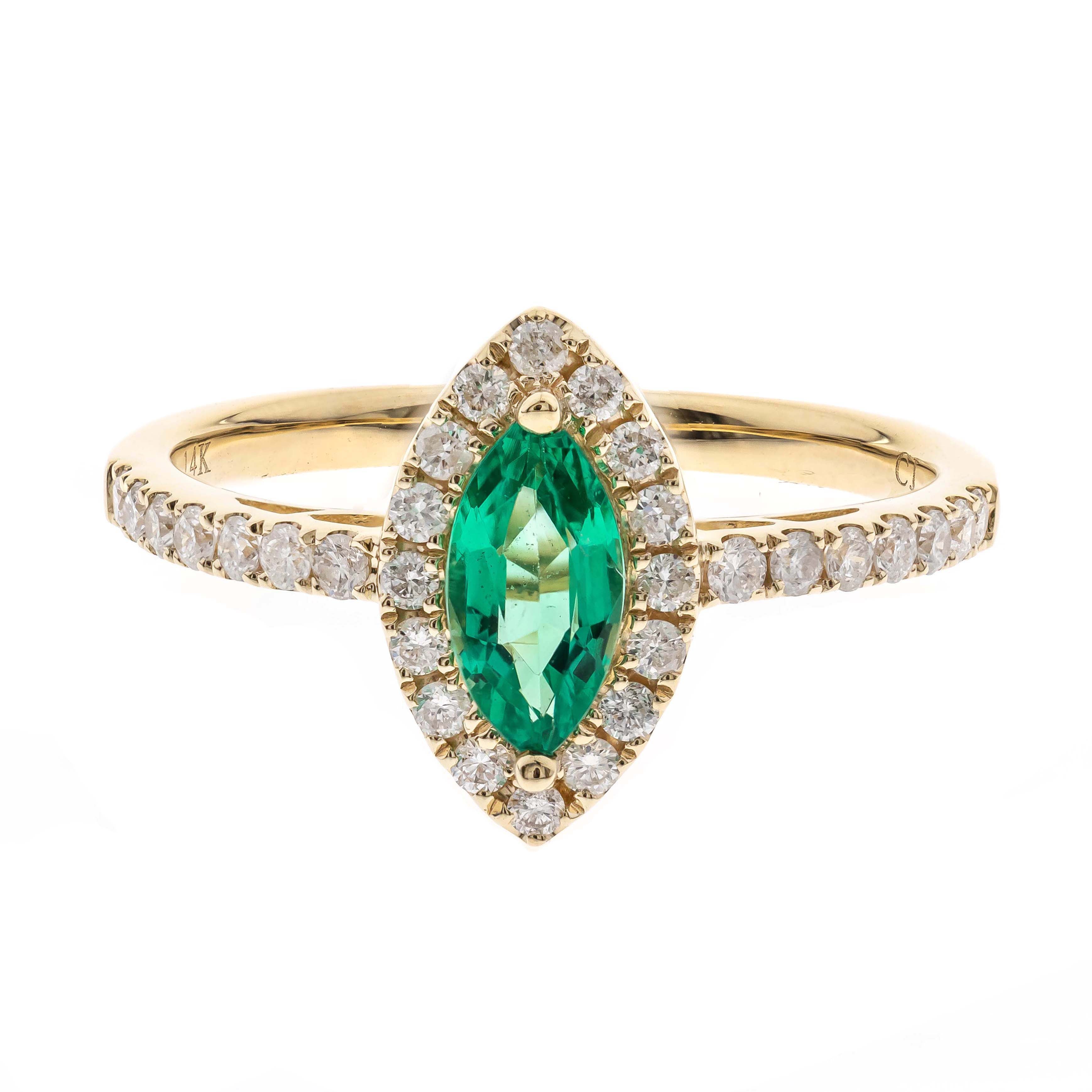 Decorate yourself in elegance with this Ring is crafted from 14-karat Yellow Gold by Gin & Grace. This Ring is made up of Marquise-Cut Emerald (1 pcs) 0.48 carat and Round-cut White Diamond (30 Pcs) 0.34 Carat. This Ring is weight 1.86 grams. This delicate Ring is polished to a high finish shine.