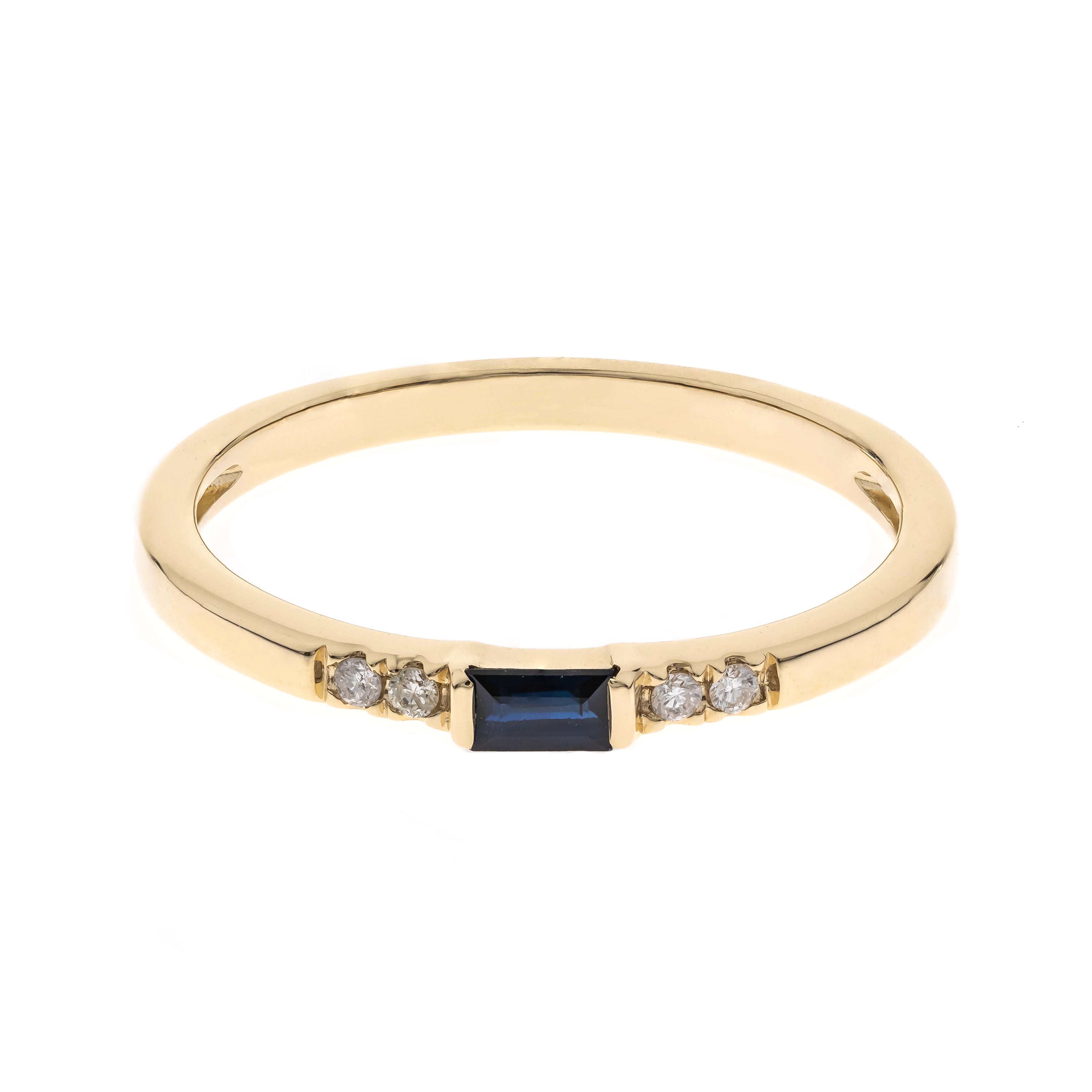 Stunning, timeless and classy eternity engagement ring. Decorate yourself in luxury with this Gin & Grace ring. The 14k Yellow Gold jewelry boasts Baguette-Cut Channel Setting Ceylon Blue Sapphire (1 pcs) 0.12 Carat and Round-Cut Prong Setting Diamond (4 pcs) 0.04 Carat accent stones for a lovely design. This ring weighs 1.72 grams. Crafted with 14k Yellow Gold, this delicate Ring is polished to a high finish shine