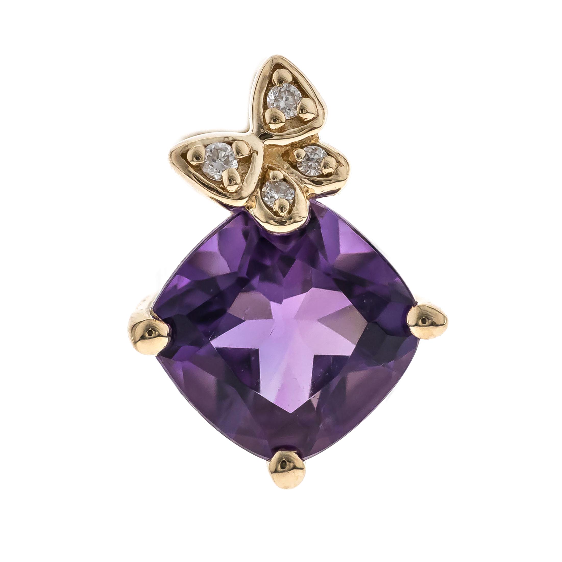 Decorate yourself in elegance with this Pendant is crafted from 10-karat Yellow Gold by Gin & Grace. This Pendant is made up of 6.0 mm Brazilian Amethyst Cushion-cut (1 pcs) 0.88 and Round-cut White Diamond (4 Pcs) 0.013 carat. This Pendant is weight 0.52 grams. This delicate Pendant is polished to a high finish shine.