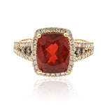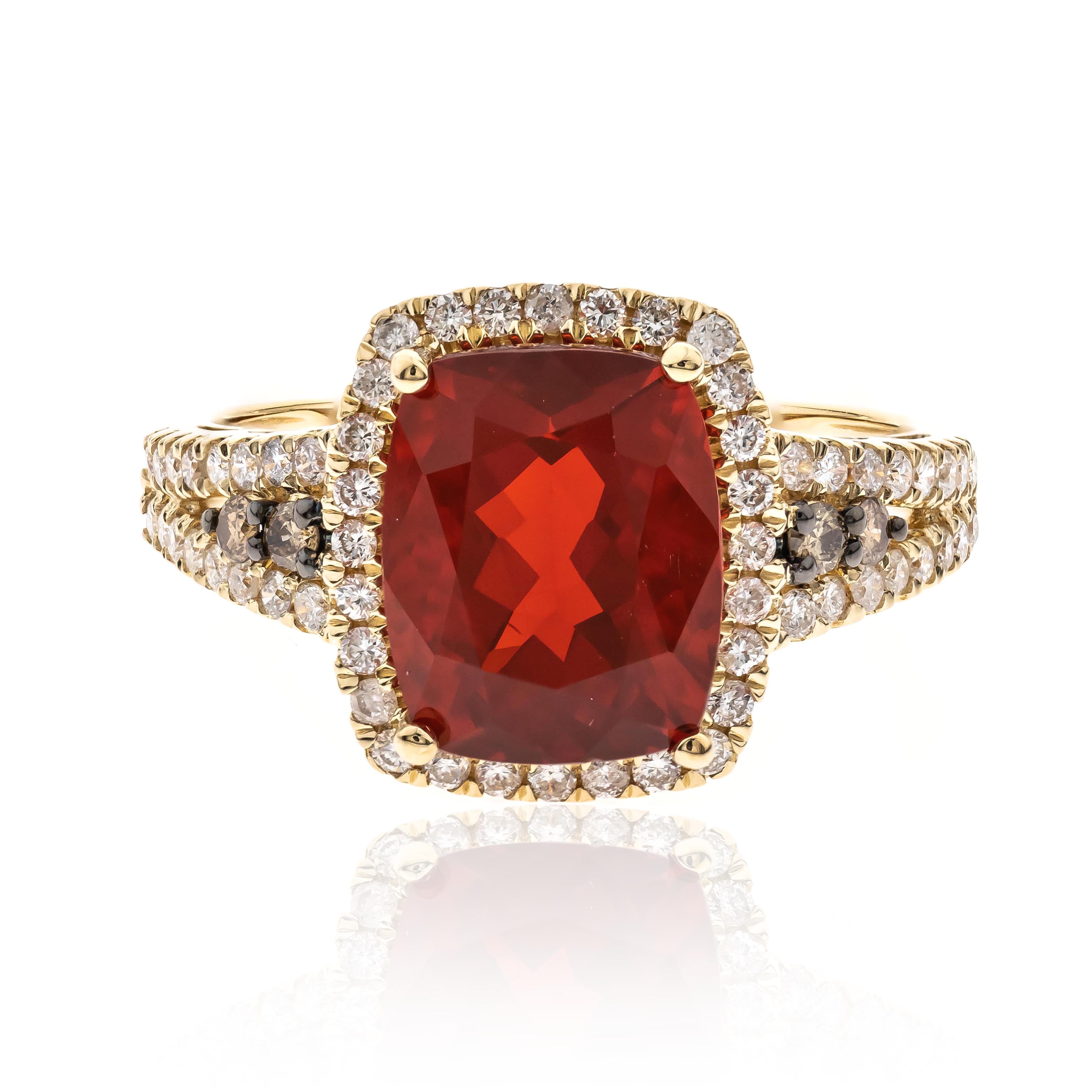 Stunning, timeless and classy eternity Unique Ring. Decorate yourself in luxury with this Gin & Grace ring. This ring is made up of Cushion-Cut Prong Setting Genuine Mexican Fire Opal (1 pcs) 1.9 Carat, Brown Diamonds(4pcs) 0.09ct and Round Diamonds (60 Pcs) 0.41 Carat accent stones for a lovely design. This ring is weight 3.2 grams. The Ring is crafted of shining 14K Yellow Gold and is completed by a highly polished finish.