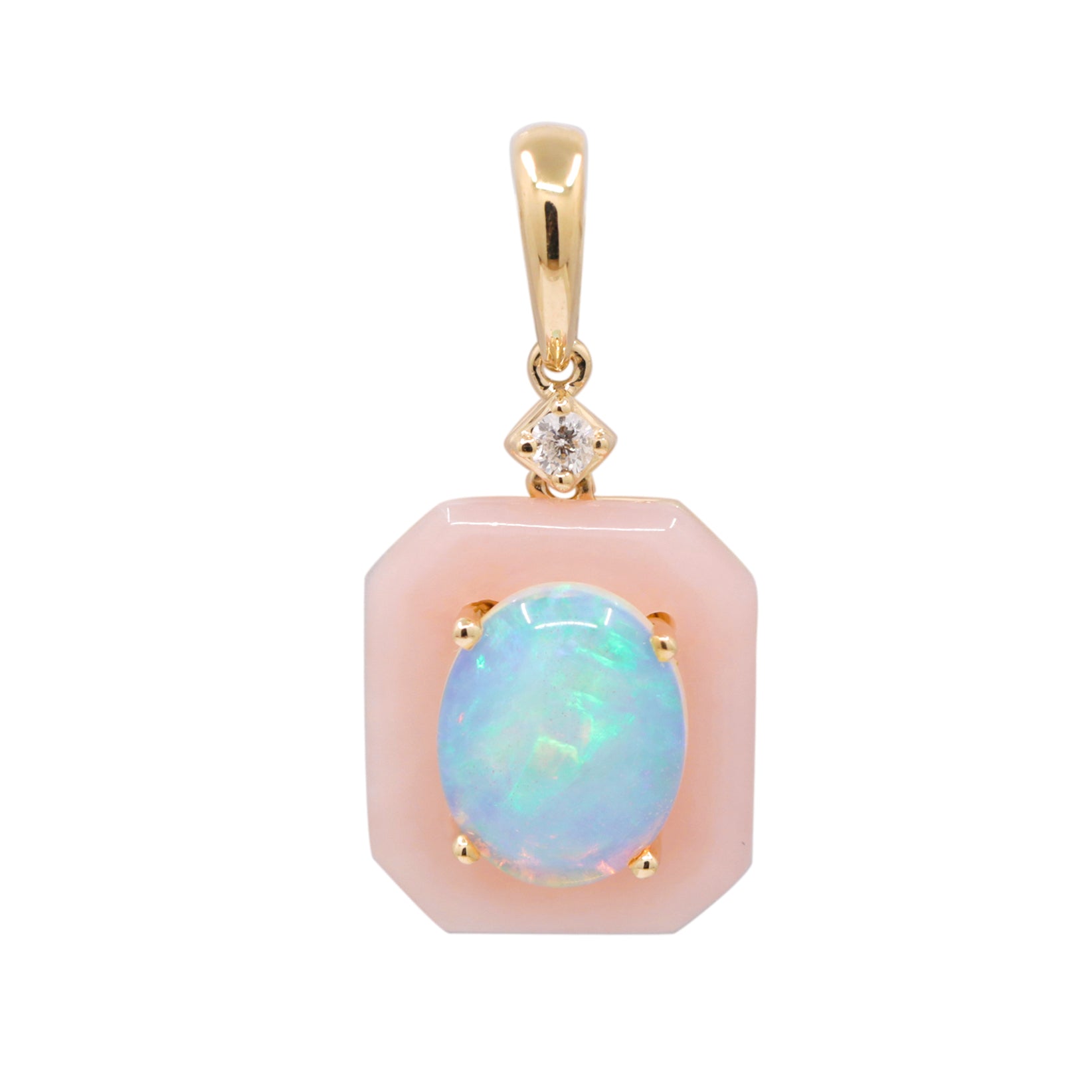 Crafted in radiant 14K yellow gold, this pendant showcases a mesmerizing 1.39-carat Ethiopian opal at its center, known for its vibrant color play. Surrounding it is a halo of soft pink opals totaling 2.08 carats, adding a warm, rosy touch to the piece. A single diamond accent at the top completes the design with a touch of sparkle, making this pendant a beautiful statement of elegance and refinement. Perfect for adding timeless charm to any jewelry collection.