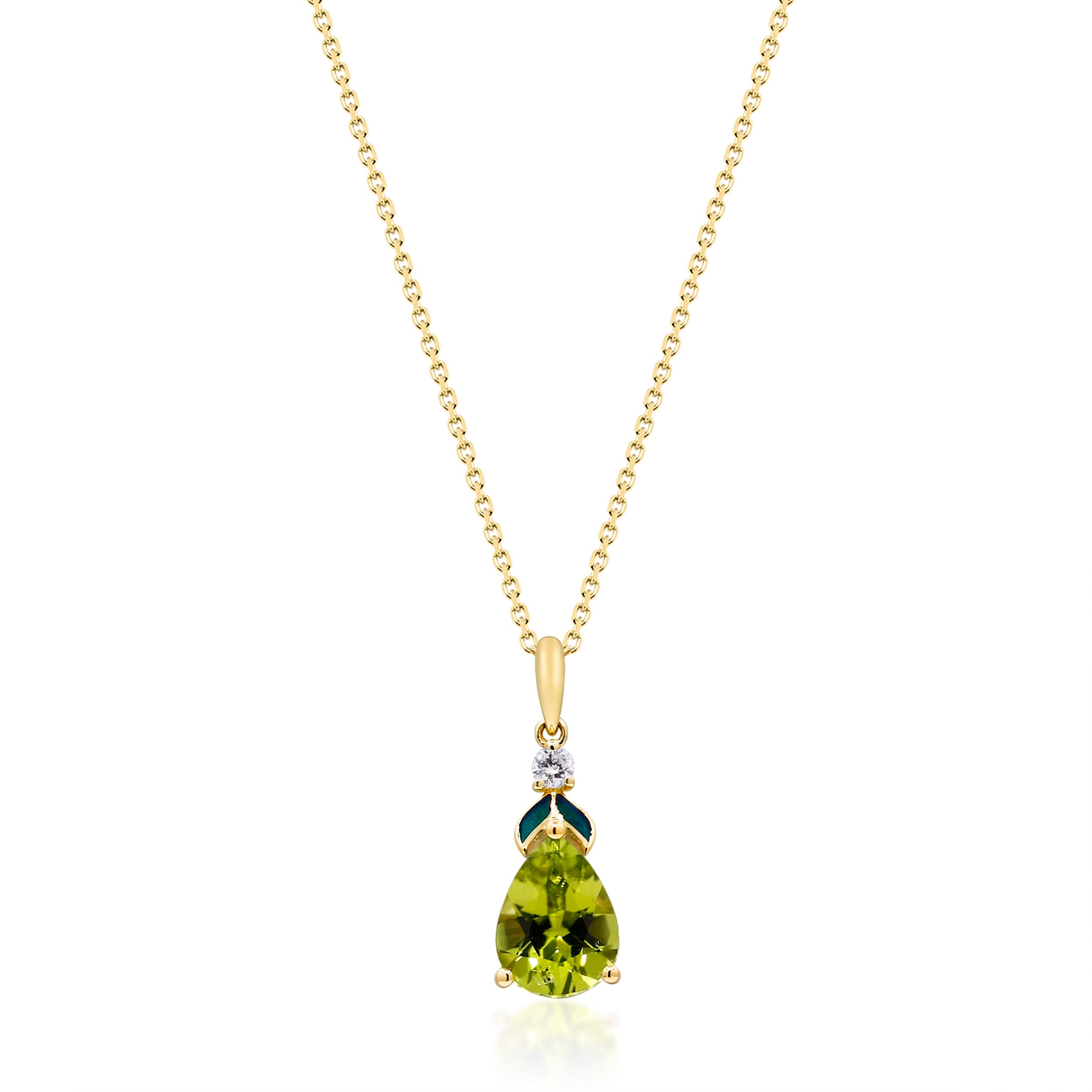Decorate yourself in elegance with this Pendant is crafted from 10-karat Yellow Gold by Gin & Grace. This Pendant is made up of 9x7 mm Pear-Cut Manchurian Peridot (1 pcs) 1.75 carat and Round-cut White Diamond (1 Pcs) 0.07 Carat. This Pendant is weight 1.95 grams. This delicate Pendant is polished to a high finish shine.