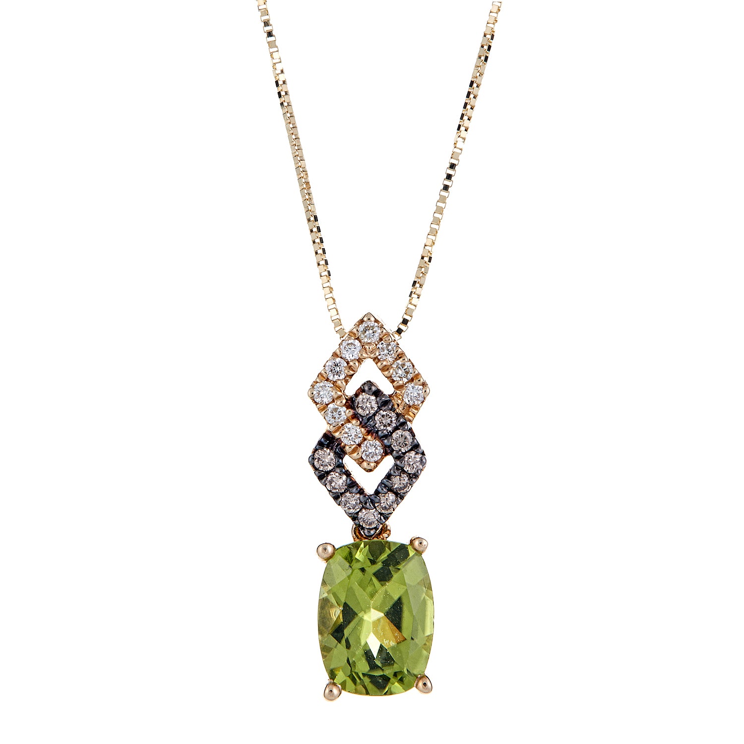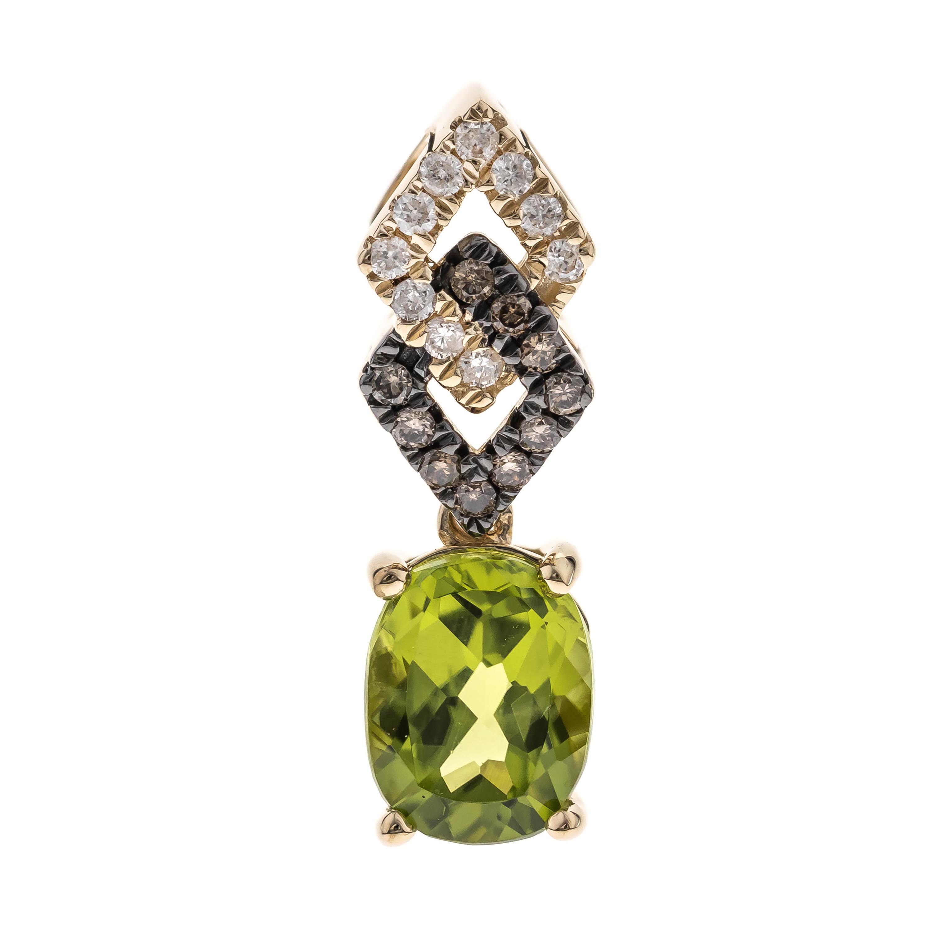 Decorate yourself in elegance with this Pendant is crafted from 10-karat Yellow Gold by Gin & Grace Genuine Peridot Pendant. This Pendant is made up of 6X8 mm Cushion-cut Prong setting Genuine Manchurian Peridot (1 Pcs) 1.40 Carat and Round-Cut Prong setting Natural Brown Diamond (10 Pcs) 0.07 Carat and Round-Cut Prong setting Natural White Diamond (10 Pcs) 0.07 Carat. This Pendant is weight 1.07 grams. The gorgeous Pendant hangs from a 18-inch wheat chain. This delicate Pendant is polished to a high finish shine.