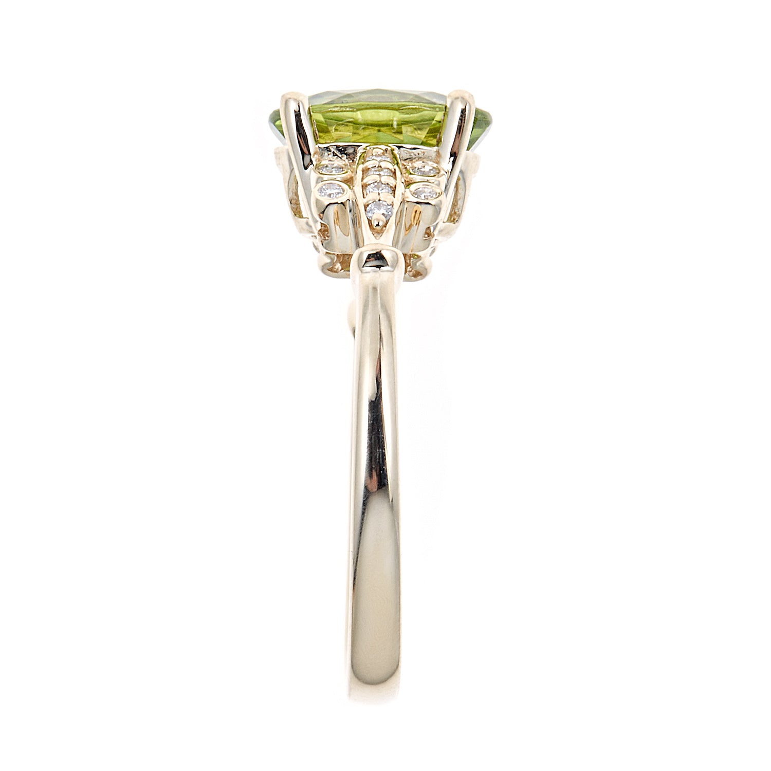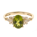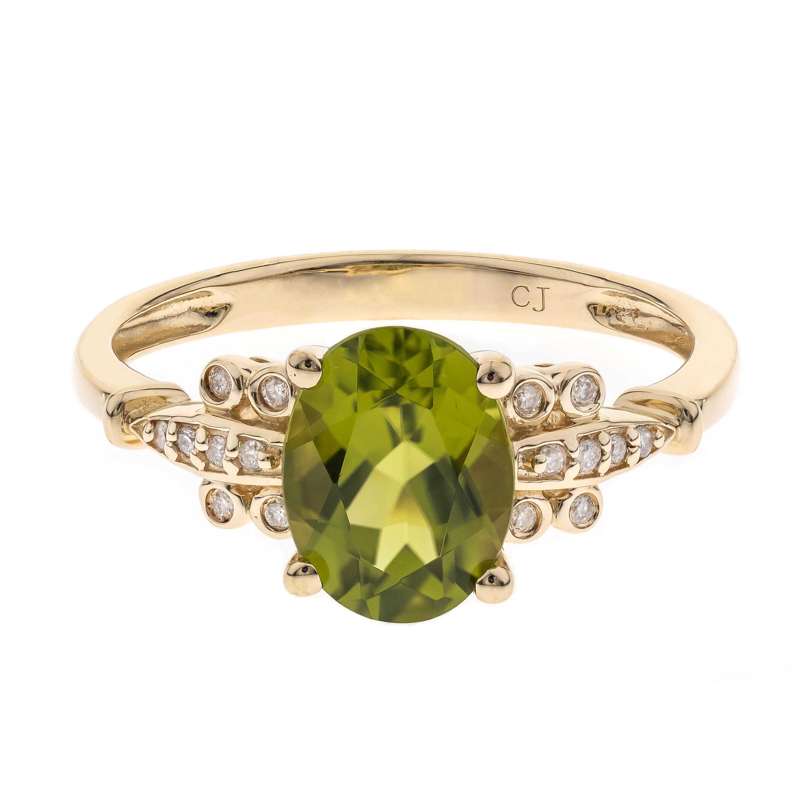 Stunning, timeless and classy eternity Unique ring. Decorate yourself in luxury with this Gin & Grace ring. This ring is made up of 7X9 mm Oval-Cut Prong Setting Genuine Manchurian Peridot (1 pcs) 2.0 Carat and Round-Cut Prong Setting Natural Diamond (16 pcs) 0.08 Carat accent stones for a lovely design. This ring is weight 2.10 grams. The ring is crafted of shining 10-karat Yellow Gold and is completed by a highly polished finish..