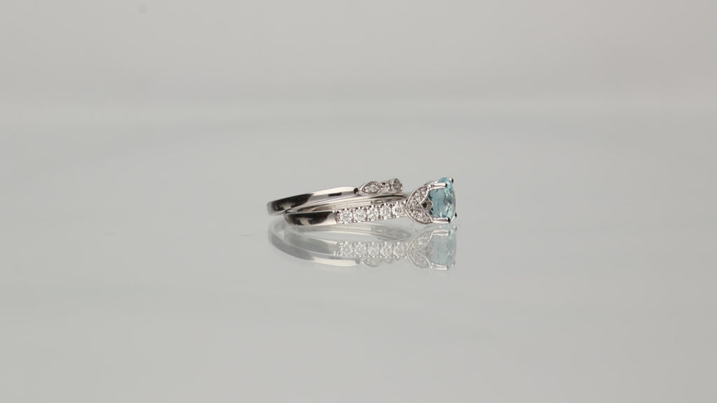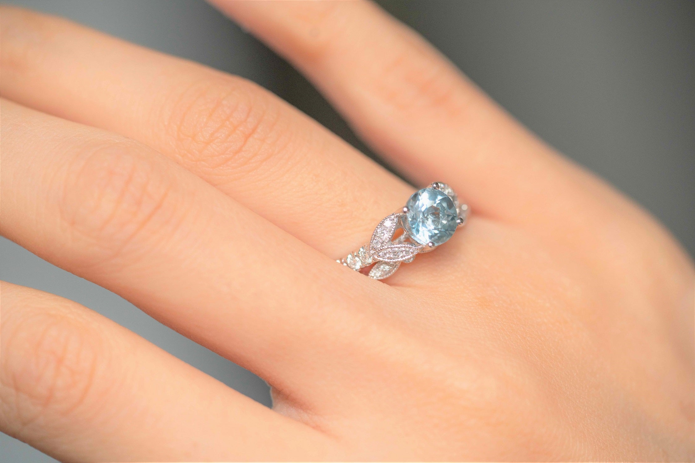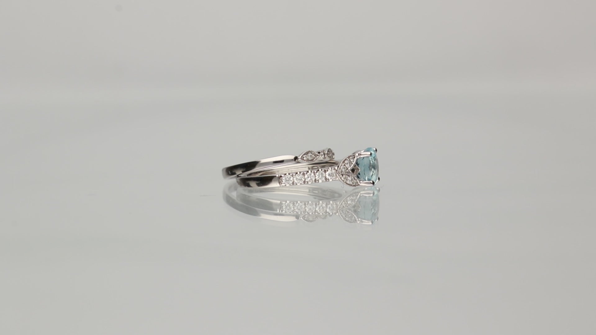 Stunning, timeless and classy eternity Engagement ring. Decorate yourself in luxury with this Gin & Grace ring. This ring is made up of Round-Cut Prong Setting Genuine Brazilian Aquamarine (1pcs) 0.94 Carat and Round-Cut Prong Setting Diamond (41 pcs) 0.38Carat accent stones for a lovely design. This ring is weight 4.18 grams. The ring is crafted of shining 14-karat White Gold and is completed by a highly polished finish.