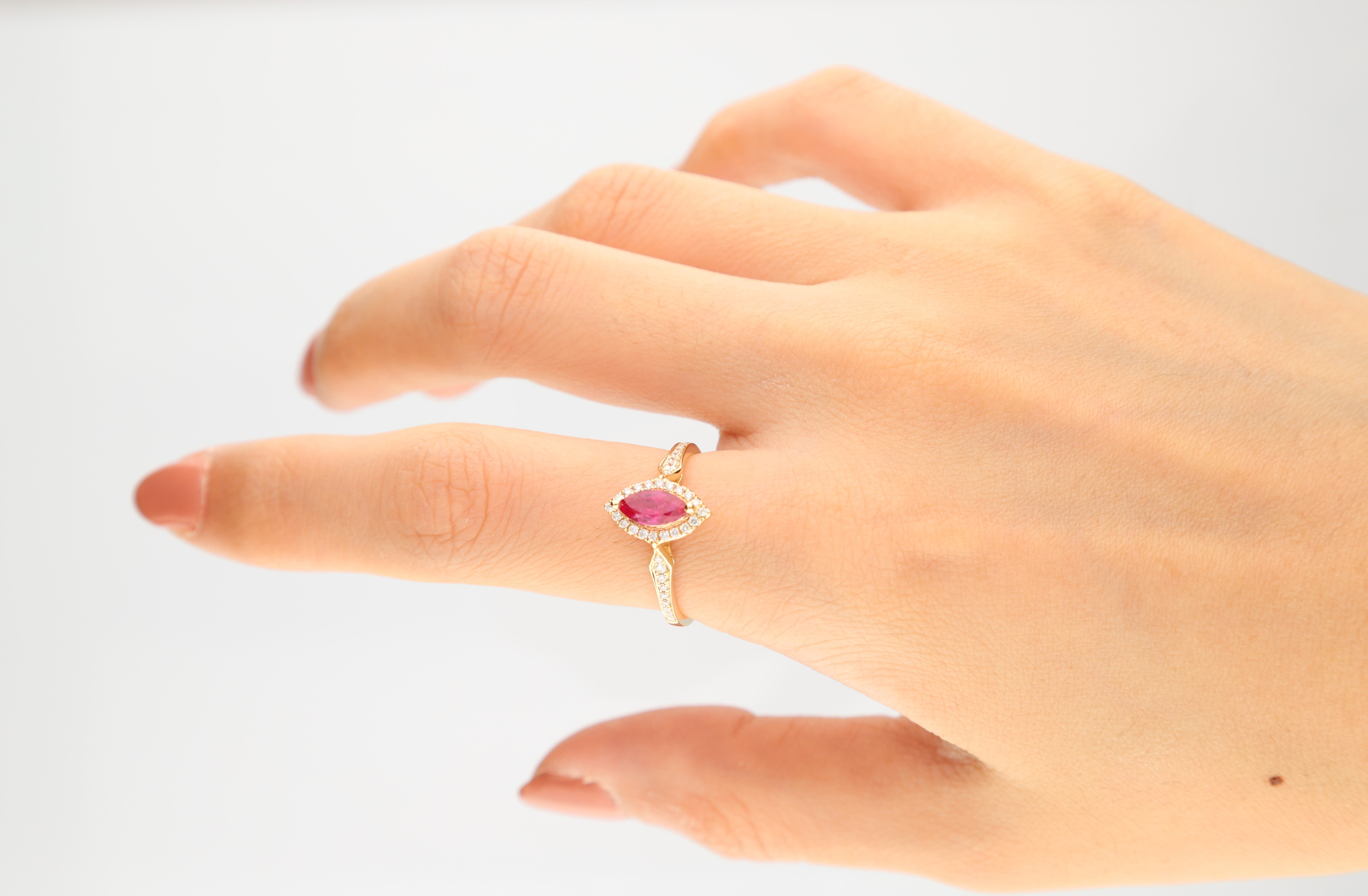 Stunning, timeless and classy eternity Unique Ring. Decorate yourself in luxury with this Gin & Grace Ring. The 10K Yellow Gold jewelry boasts Marquise-Cut Prong Setting Natural Mozambique Ruby (1 pc) 0.65 Carat, along with Natural Round cut white Diamond (38 Pcs) 0.17 Carat, accent stones for a lovely design. This Ring is weight 1.84 grams. Crafted with 10K Yellow Gold, this delicate Ring is polished to a high finish shine.