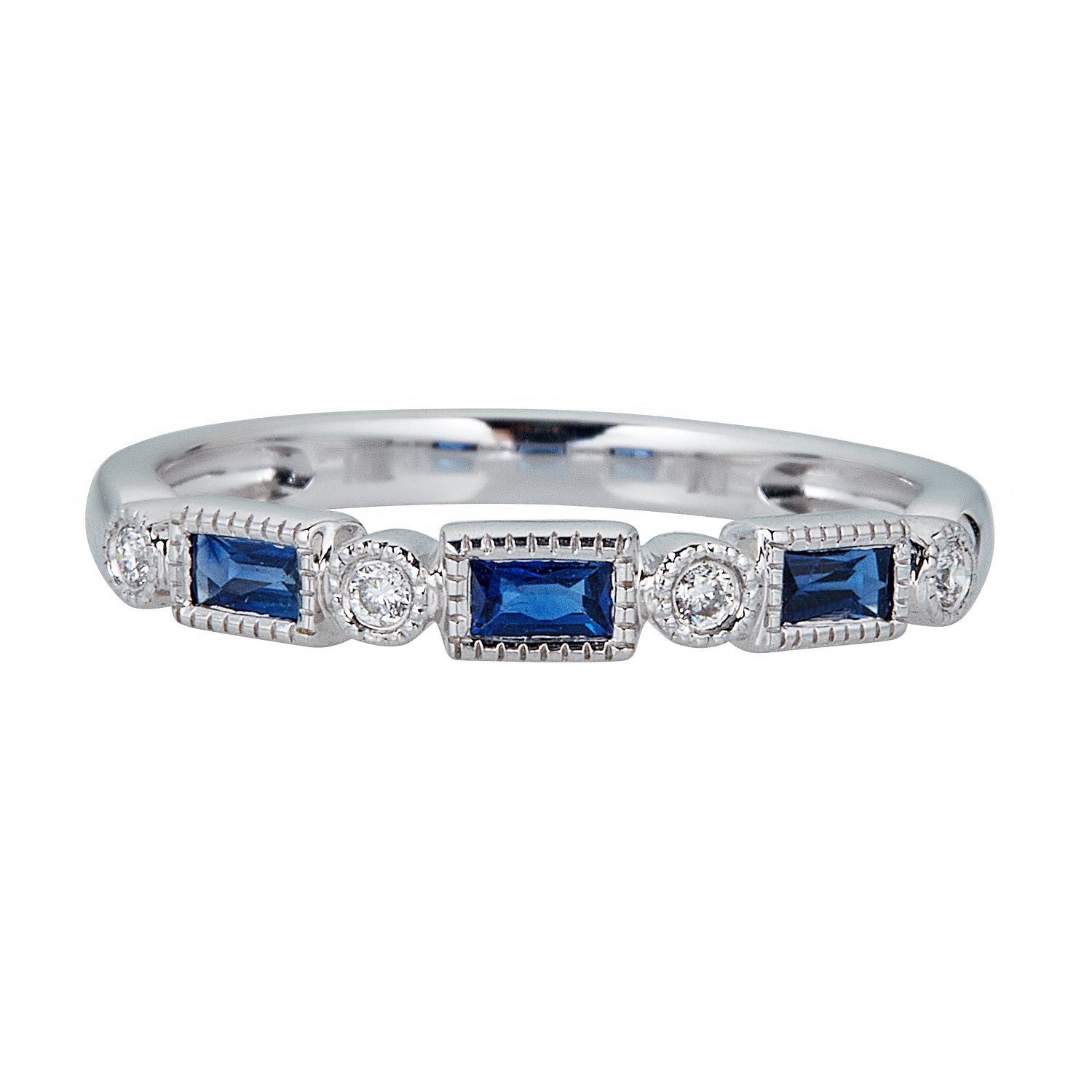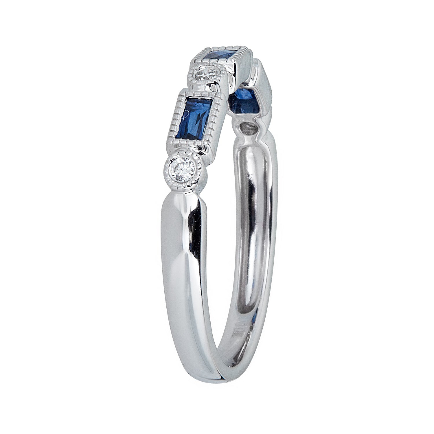 Decorate yourself in elegance with this Ring is crafted from 14-karat White Gold by Gin & Grace. This Ring is made up of Baguette-cut (3 pcs) 0.41 carat Ceylon Blue Sapphire and Round Cut Diamond (4 Pcs) 0.06 Carat. This Ring is weight 1.85 grams. This delicate Ring is polished to a high finish shine.