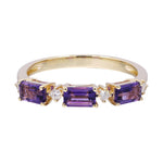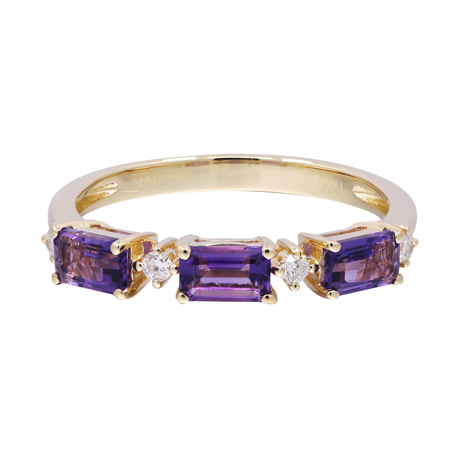 Stunning, timeless and classy eternity Unique Ring. Decorate yourself in luxury with this Gin & Grace Ring. The 10K Yellow Gold jewelry boasts Emerald-Cut Prong Setting Natural Amethyst (3 pc) 0.81 Carat, along with Natural Round cut white Diamond (4 Pcs) 0.09 Carat, accent stones for a lovely design. This Ring is weight 1.45 grams. Crafted with 10K Yellow Gold, this delicate Ring is polished to a high finish shine.
