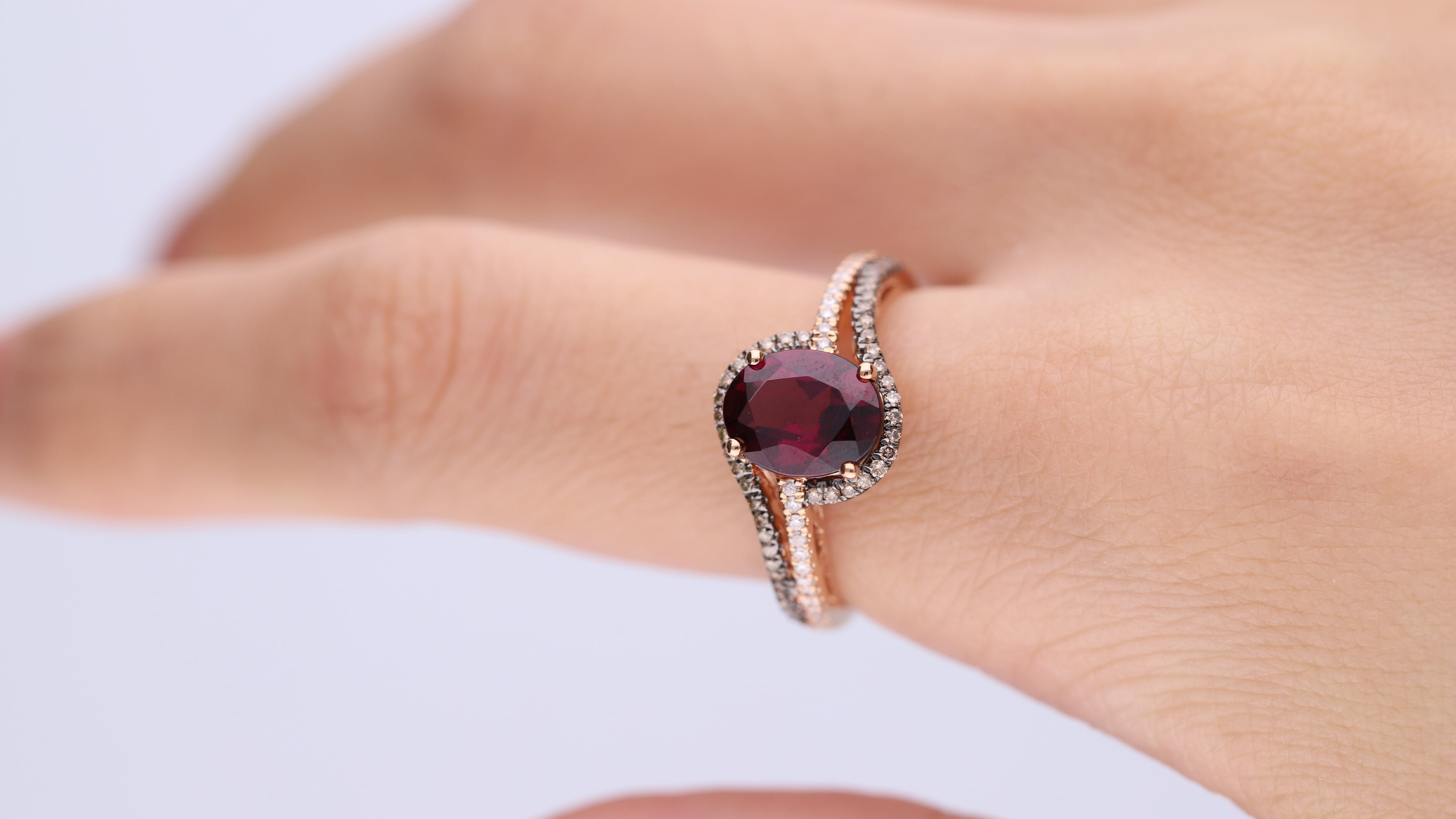 Stunning, timeless and classy eternity Unique Ring. Decorate yourself in luxury with this Gin & Grace Ring. The 10K Rose Gold jewelry boasts Oval-Cut Prong Setting Raspberry color Natural Madagascar Rhodolite Garnet (1 pc) 2.09 Carat, along with Natural Round cut white Diamond (24 Pcs) 0.09 Carat and Natural Round cut Brown Diamond (45 Pcs) 0.20 Carat, accent stones for a lovely design. This Ring is weight 2.39 grams. Crafted with 10K Rose Gold, this delicate Ring is polished to a high finish shine