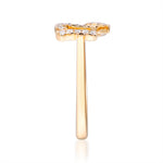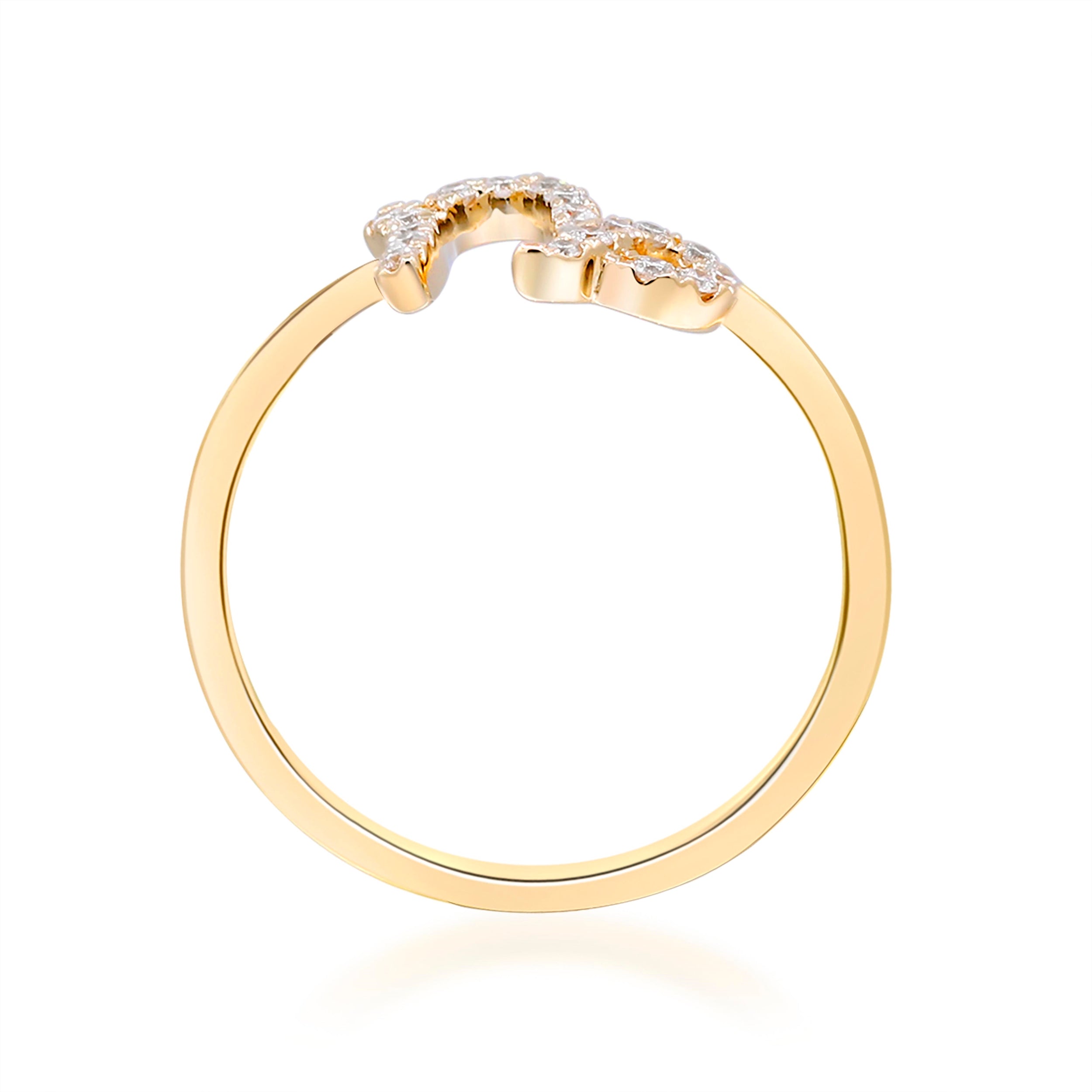 Contemporary and modern, this ring is a work of art. The curving band seamlessly flows from Yellow Gold encrusted with round-cut white diamonds that add sparkle and shine to this artistic ring. Natural White Diamonds Diamonds: 19Â Pcs Round cut Natural Round Diamond measurements: Each measure 1 mm Diamond weight: 0.16 carat Color: G-H Clarity: I1-I2 Setting: Prong Metal information and dimensions Metal: 10K Yellow gold Finish: High polish Metal weight:1.56 grams Ring setting dimensions: 20 mm wide x 4 mm long x 2 mm deep Band dimensions: 2 mm wide