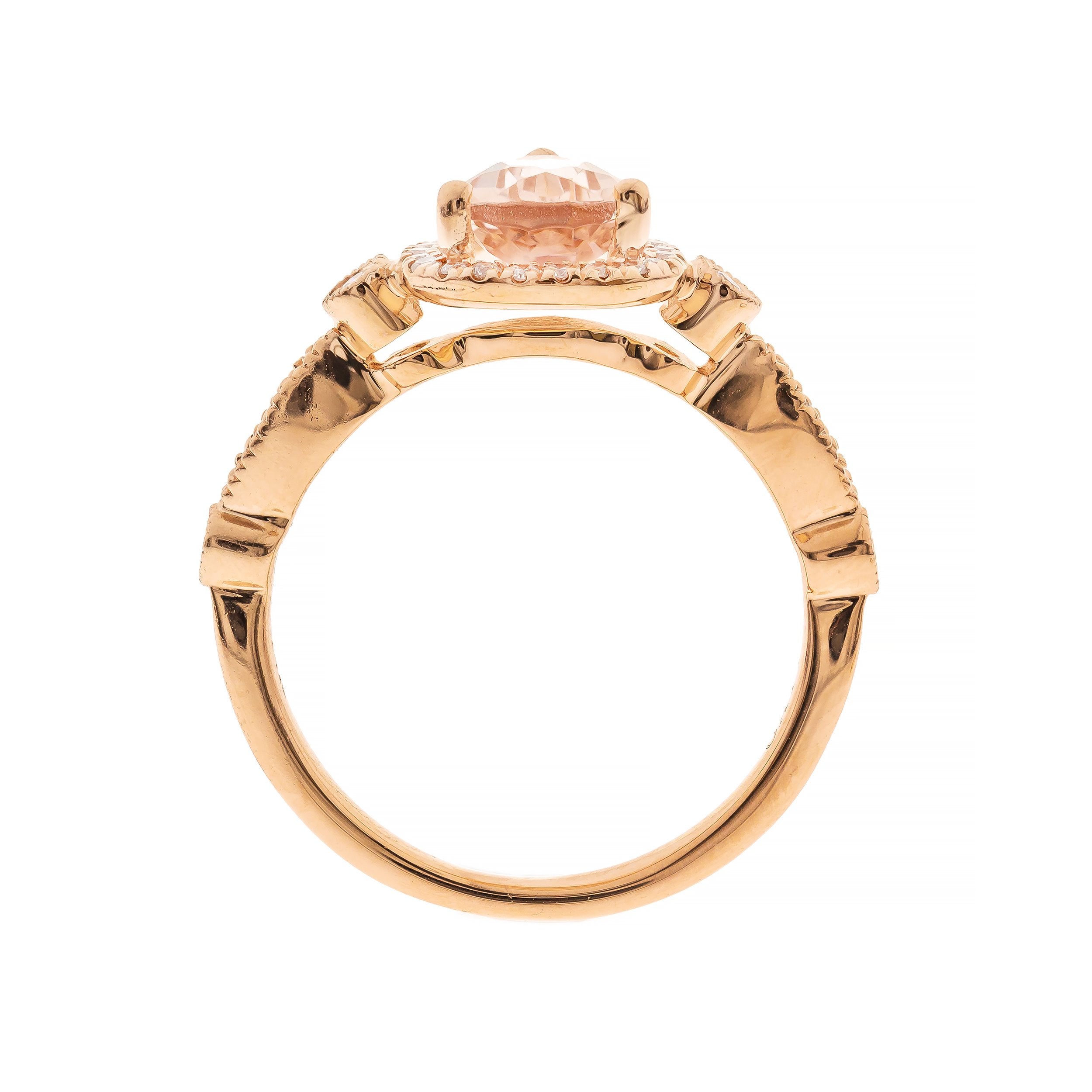 Decorate yourself in elegance with this Ring is crafted from 14-karat Rose Gold by Gin & Grace. This Ring is made up of 6x8 mm Pear-Cut (1 pcs) 0.85 carat Madagascar Morganite and Round-cut White Diamond (41 Pcs) 0.17 Carat. This Ring is weight 4.62 grams. This delicate Ring is polished to a high finish shine.