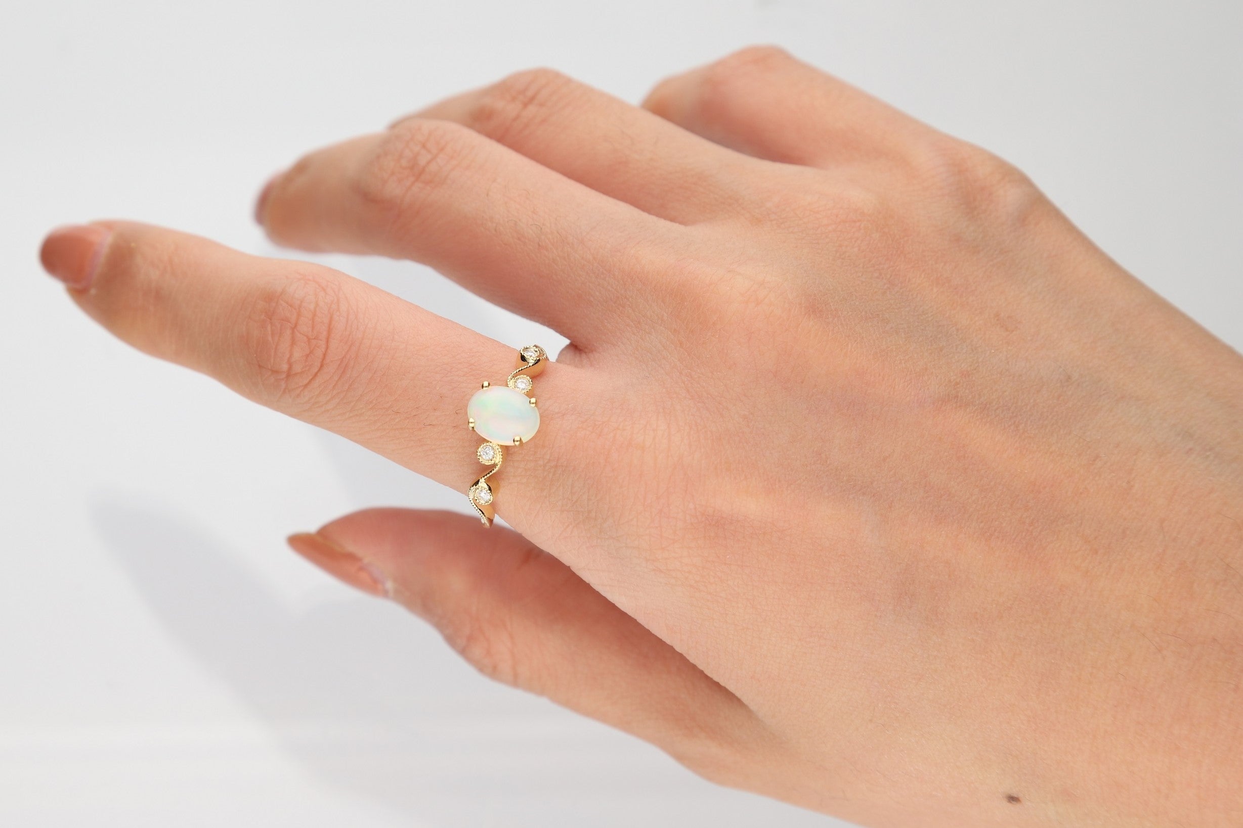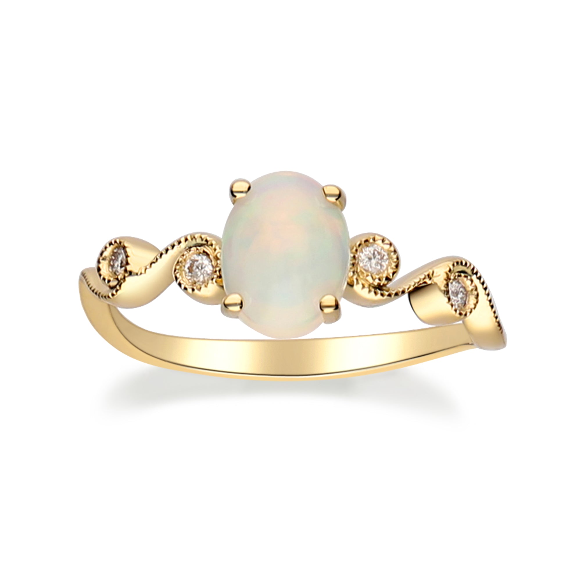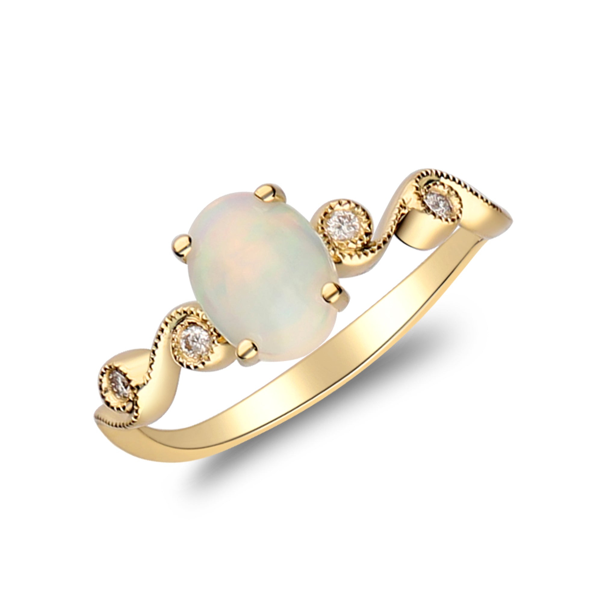 Stunning, timeless and classy eternity Unique ring. Decorate yourself in luxury with this Gin & Grace ring. This ring is made up of 8x6 MM Oval-cut Prong Setting African Opal (1 pcs) 0.84 Carat and Round-Cut Prong Setting Diamond (4 pcs) 0.05 Carat accent stones for a lovely design. This ring weighs 2.39 grams. The ring is crafted of shining 14-karat Yellow Gold and is completed by a highly polished finish.