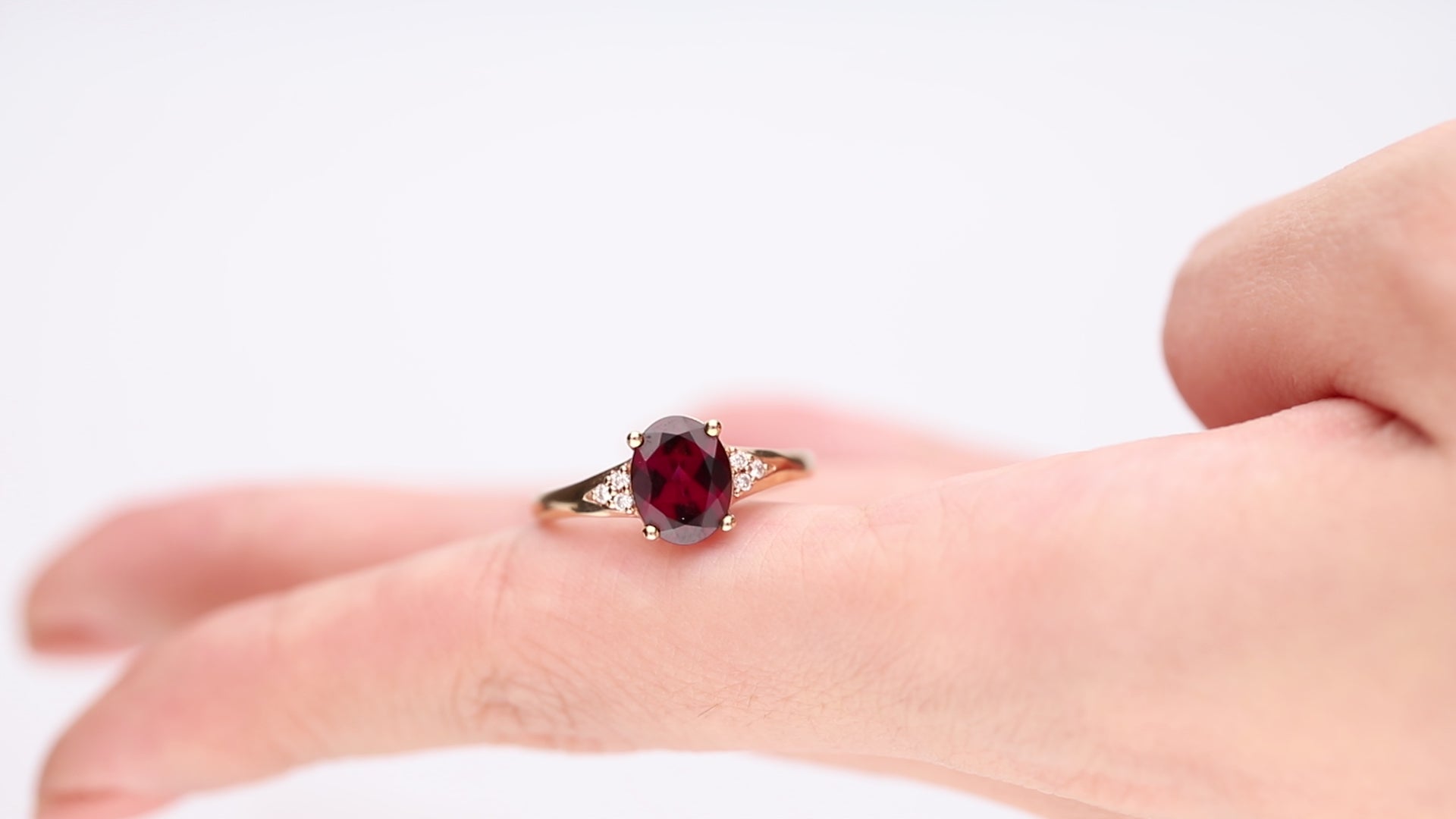 Stunning, timeless and classy eternity Unique Ring. Decorate yourself in luxury with this Gin & Grace Ring. The 10K Rose Gold jewelry boasts Oval-Cut Prong Setting Raspberry color Natural Madagascar Rhodolite Garnet (1 pc) 2.31 Carat, along with Natural Round cut white Diamond (6 Pcs) 0.05 Carat, accent stones for a lovely design. This Ring is weight 1.86 grams. Crafted with 10K Rose Gold, this delicate Ring is polished to a high finish shine