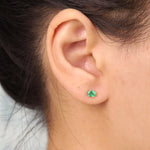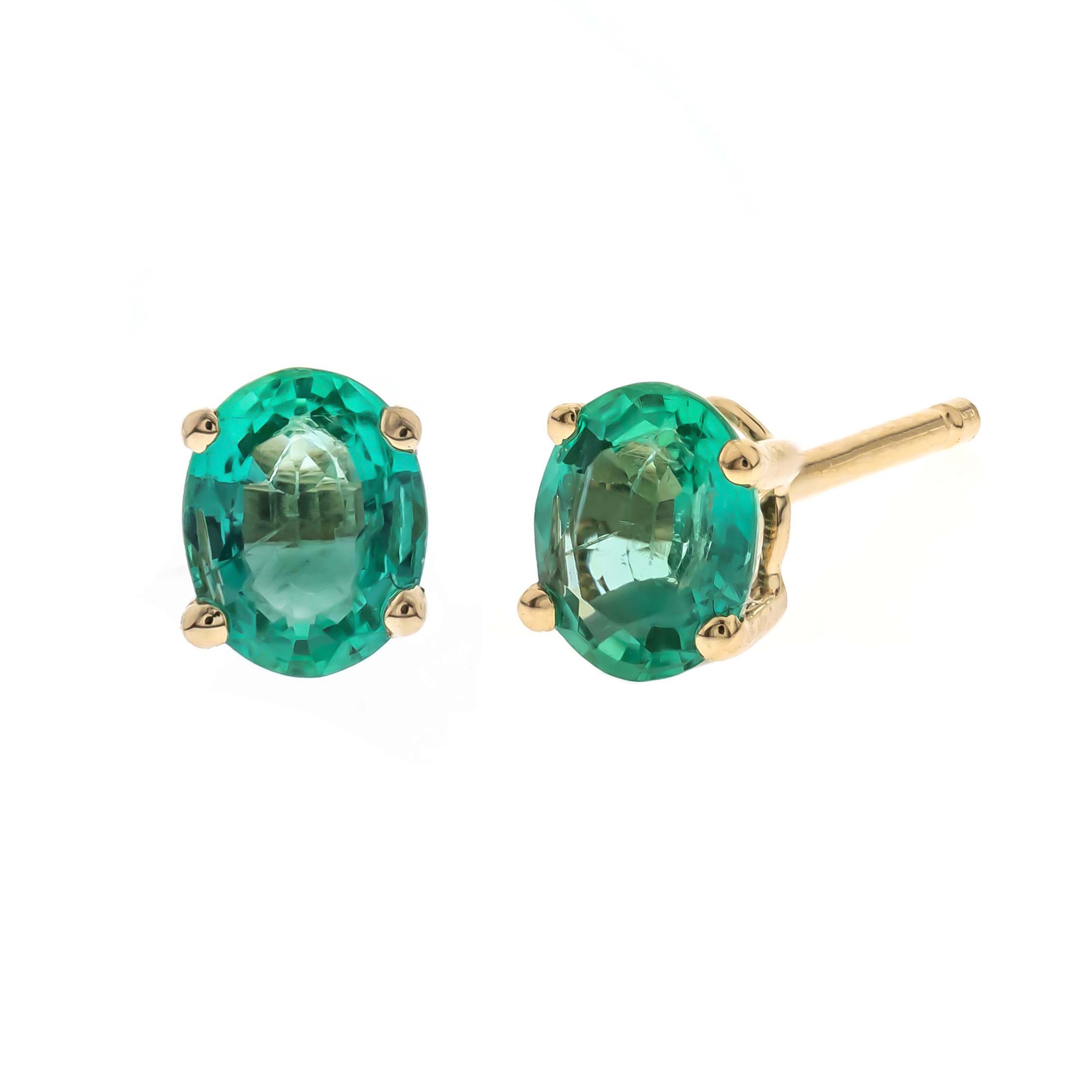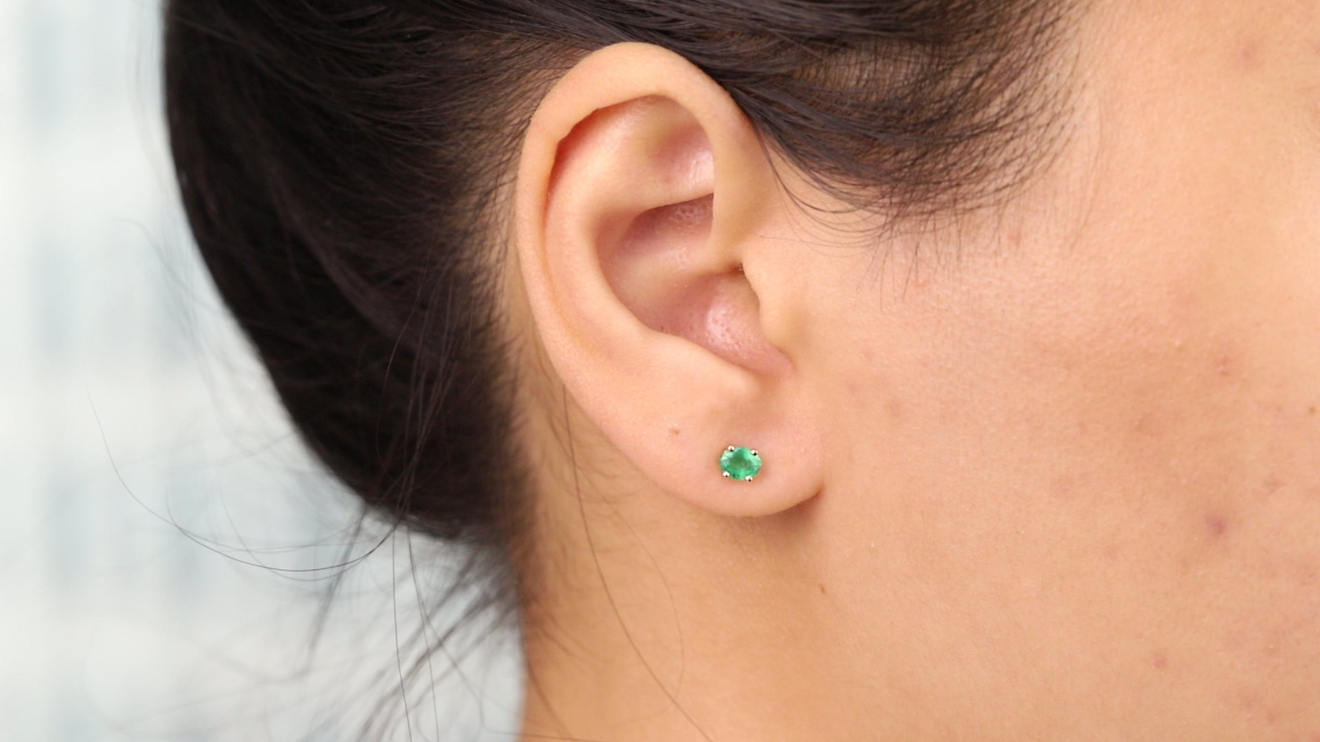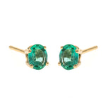Each of these earrings is adorned with a single oval-cut Natural Zambian Emerald gemstone in a four-prong setting. Style: Stud Gemstone colors: Green Gemstone shapes: Oval Two prong-set oval-cut Natural emeralds each measure 4 mm wide and 5 mm long Total gemstone weight: 0.60 carat Metal: 14k yellow gold Finish: High polish Clasp: Butterfly Metal weight: 0.62 grams Earring dimensions: 4 mm wide x 5 mm longÂ