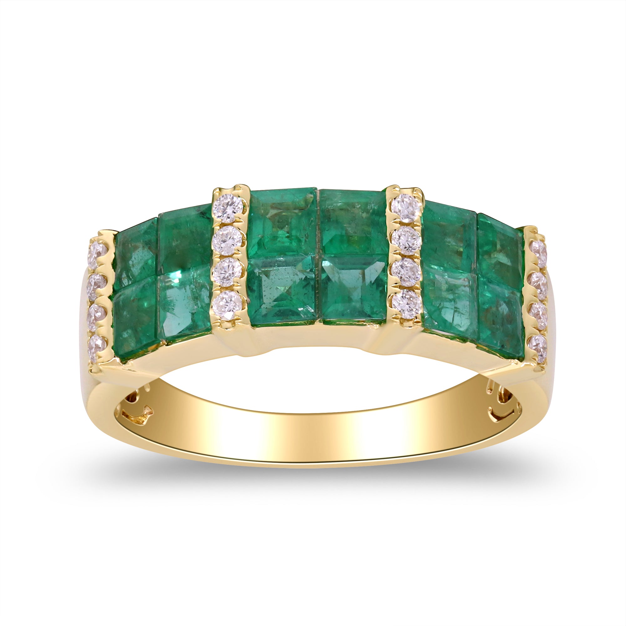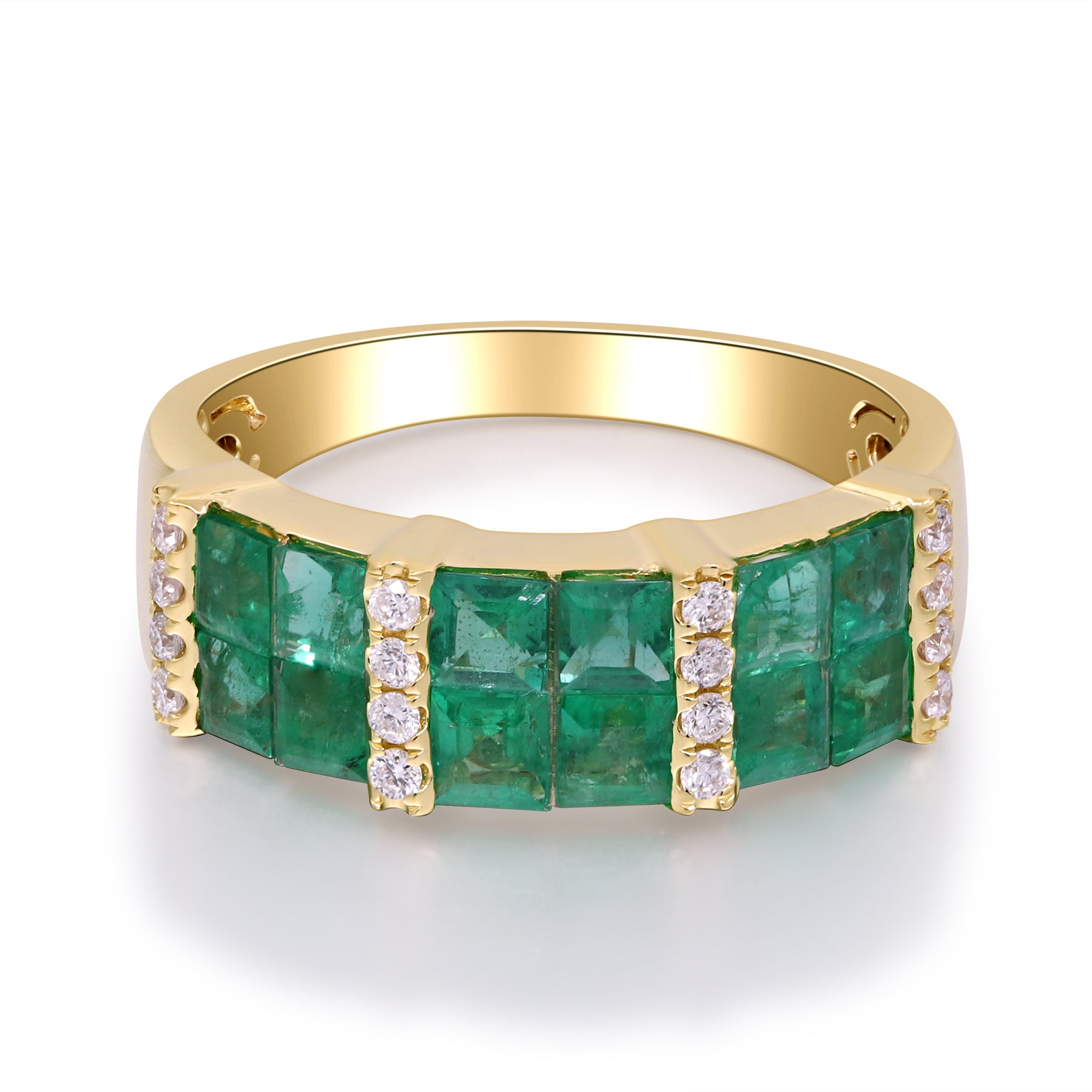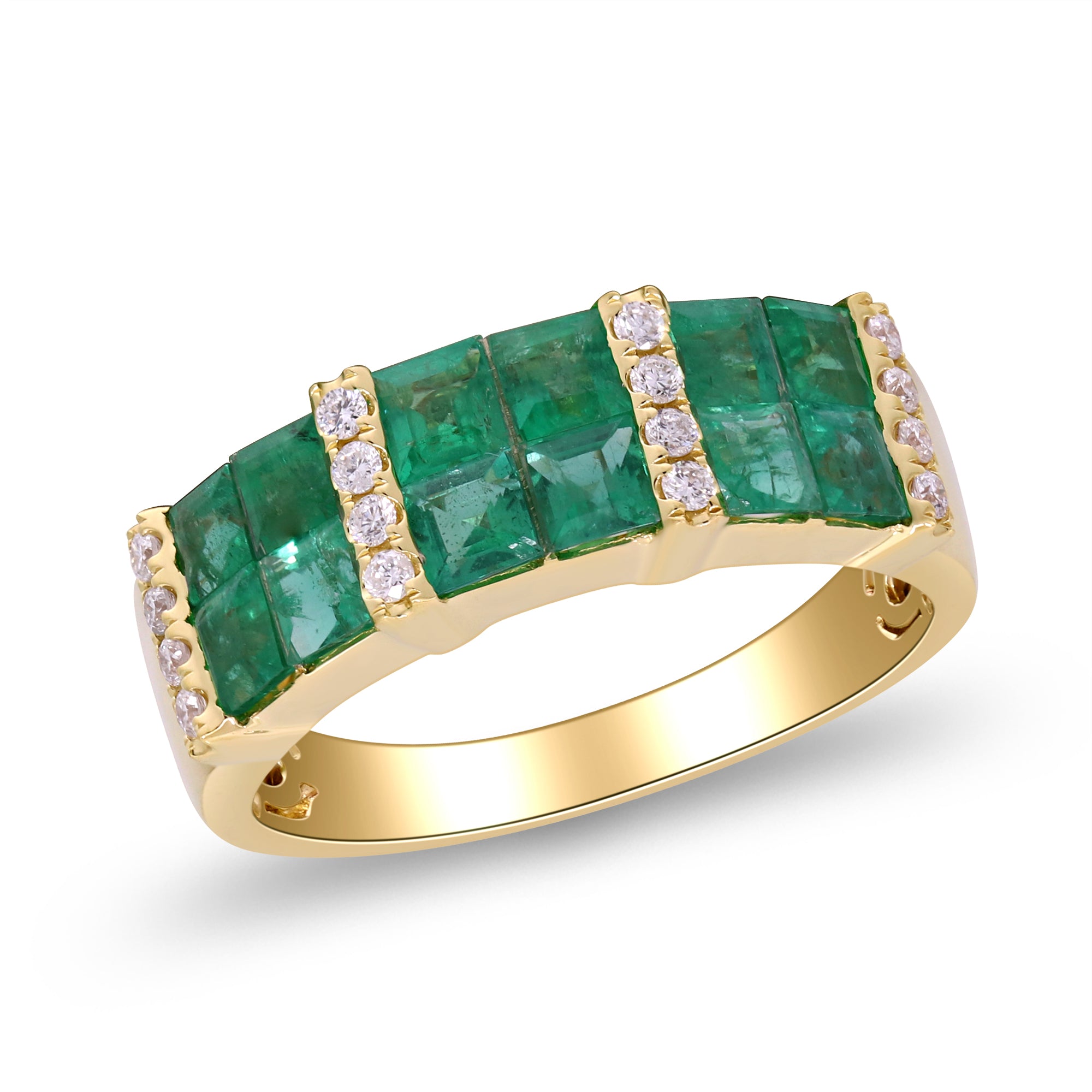 Decorate yourself in elegance with this Ring is crafted from 14-karat Yellow Gold by Gin & Grace. This Ring is made up of Square-cut (12 pcs) 1.52 carat Emerald and Round-cut Diamond (16 pcs) 0.16 Carat. This Ring is weight 3.54 grams. This delicate Ring is polished to a high finish shine.