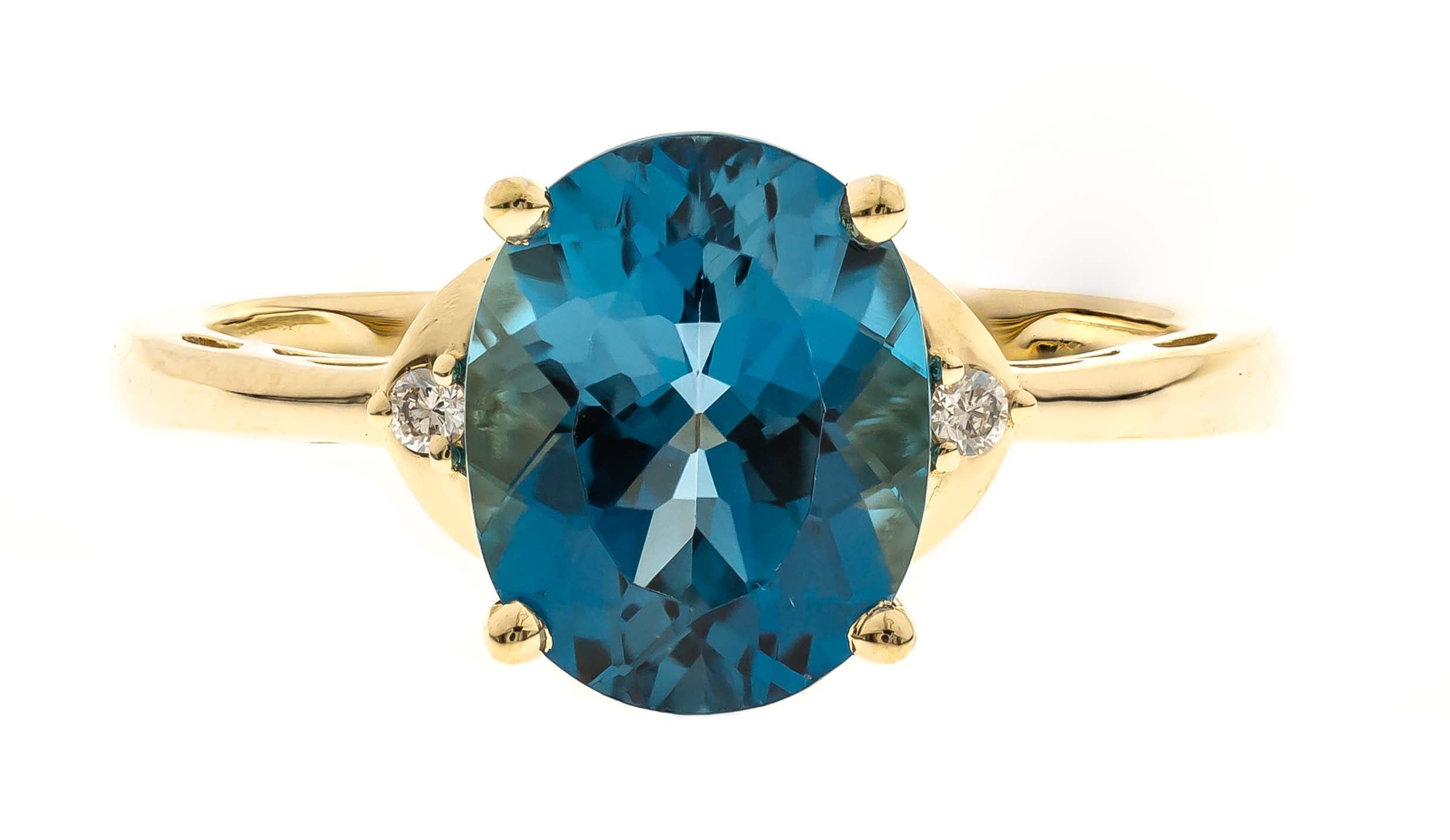 Stunning, timeless and classy eternity Engagement ring. Decorate yourself in luxury with this Gin & Grace ring. This ring is made up of Oval-Cut Prong Setting Brazilian London Blue Topaz (1 pcs) 3.24 Carat and Round-Cut Prong Setting Diamond (2 pcs) 0.03 Carat accent stones for a lovely design. This ring is weight 1.91 grams. The ring is crafted of shining 10-karat Yellow Gold and is completed by a highly polished finish.
