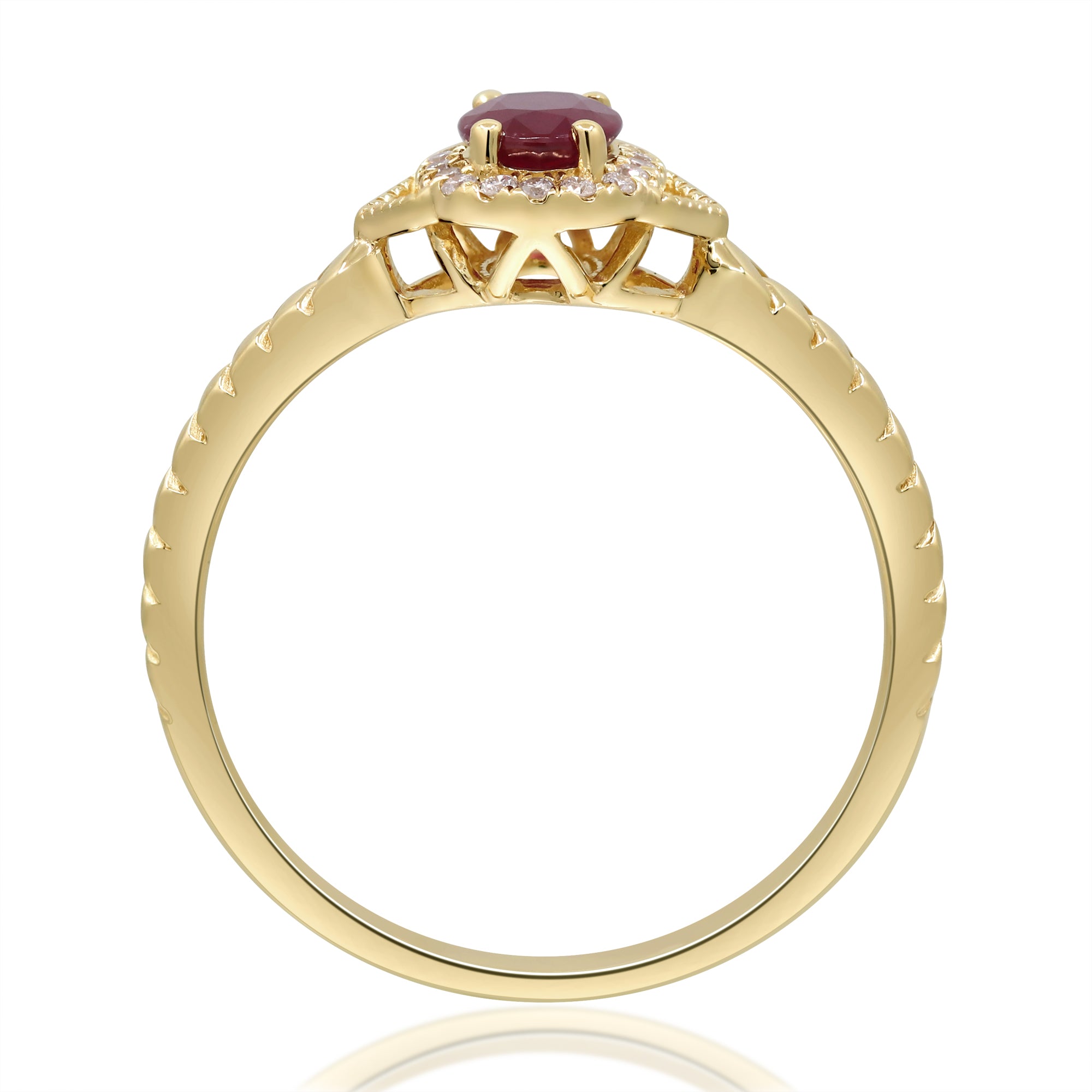 Stunning, timeless and classy eternity Unique Ring. Decorate yourself in luxury with this Gin & Grace Ring. The 14K Yellow Gold jewelry boasts Oval-Cut Prong Setting Natural Mozambique Ruby (1 pc) 0.54 Carat, along with Natural Round cut white Diamond (18 Pcs) 0.07 Carat, accent stones for a lovely design. This Ring is weight 2.12 grams. Crafted with 14K Yellow Gold, this delicate Ring is polished to a high finish shine.