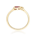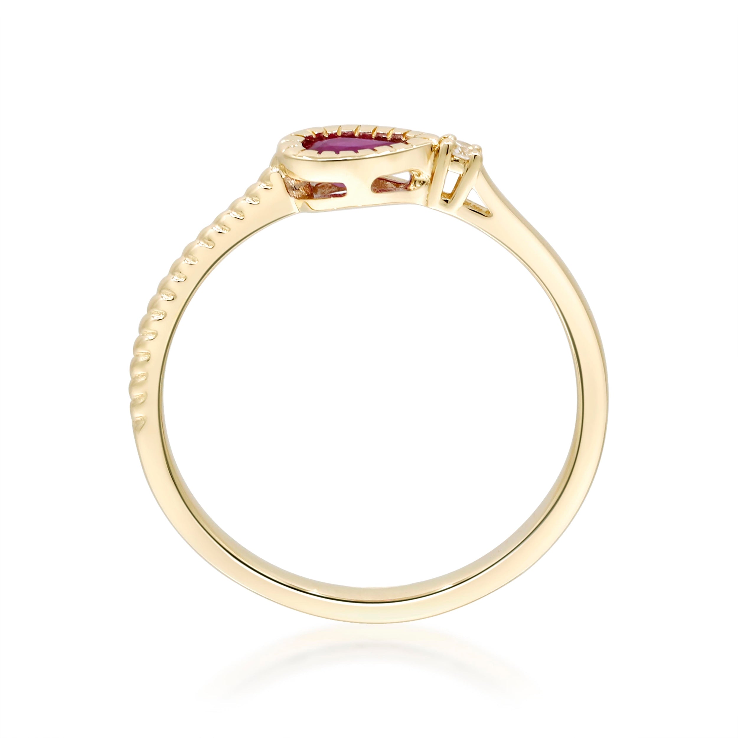 Stunning, timeless and classy eternity Unique Ring. Decorate yourself in luxury with this Gin & Grace Ring. The 14K Yellow Gold jewelry boasts Pear-Cut Prong Setting Natural Mozambique Ruby (1 pc) 0.26 Carat, along with Natural Round cut white Diamond (1 Pcs) 0.02 Carat, accent stones for a lovely design. This Ring is weight 1.69 grams. Crafted with 14K Yellow Gold, this delicate Ring is polished to a high finish shine.