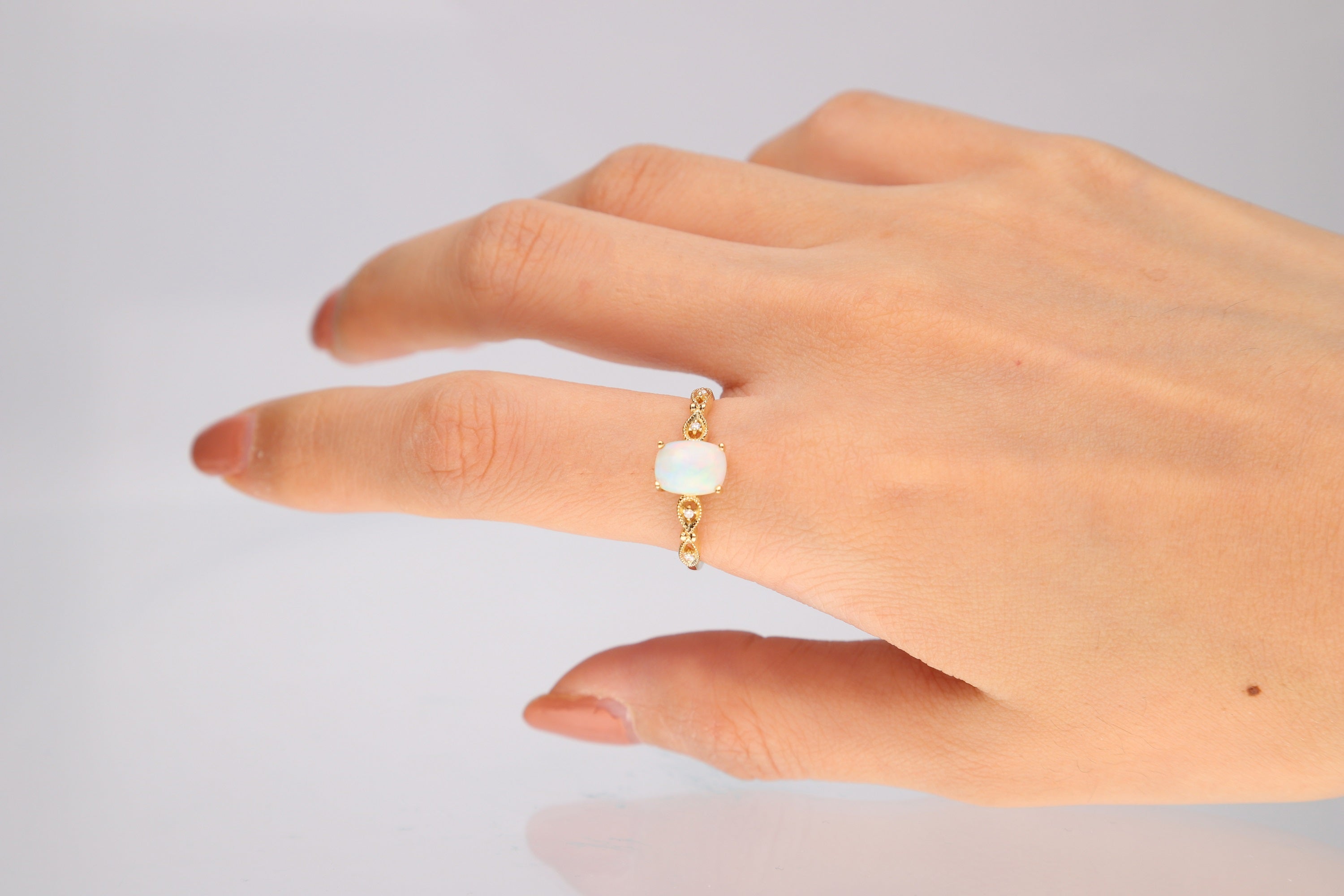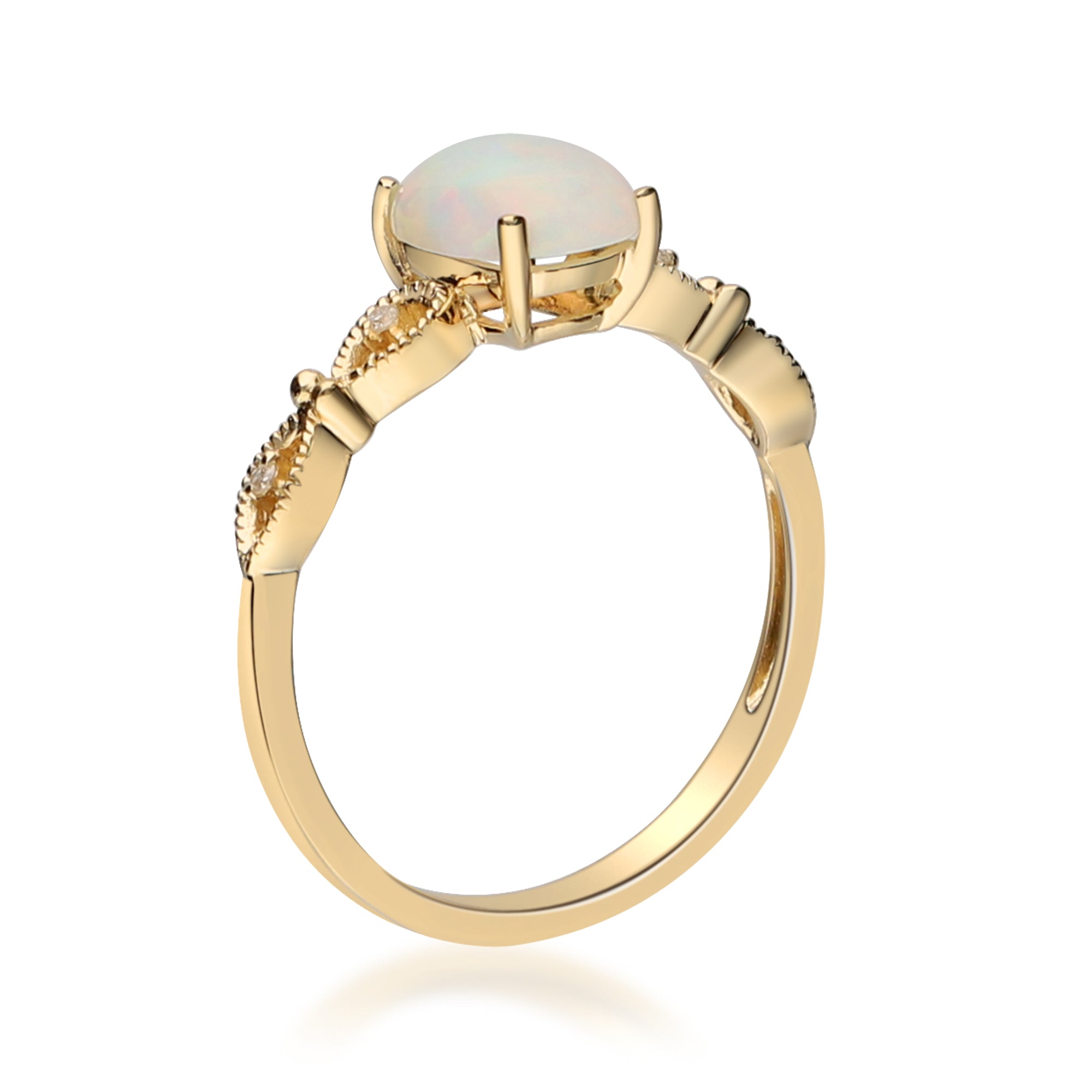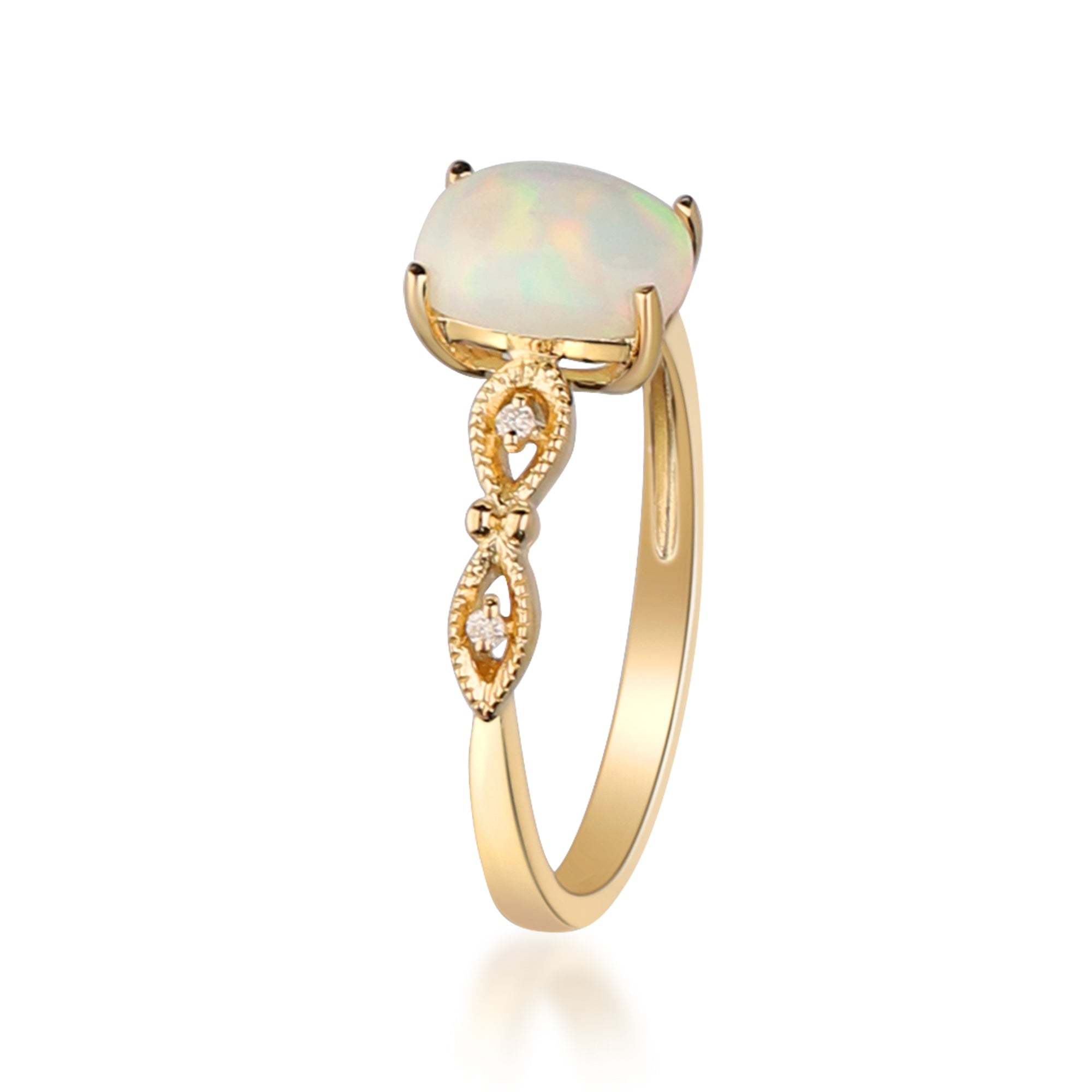 Stunning, timeless and classy eternity Unique ring. Decorate yourself in luxury with this Gin & Grace ring. This ring is made up of 8x6 MM Cushion-cut Prong Setting African Opal (1 pcs) 1.06 Carat and Round-Cut Prong Setting Diamond (4 pcs) 0.02 Carat accent stones for a lovely design. This ring is weight 2.26 grams. The ring is crafted of shining 14-karat Yellow Gold and is completed by a highly polished finish.