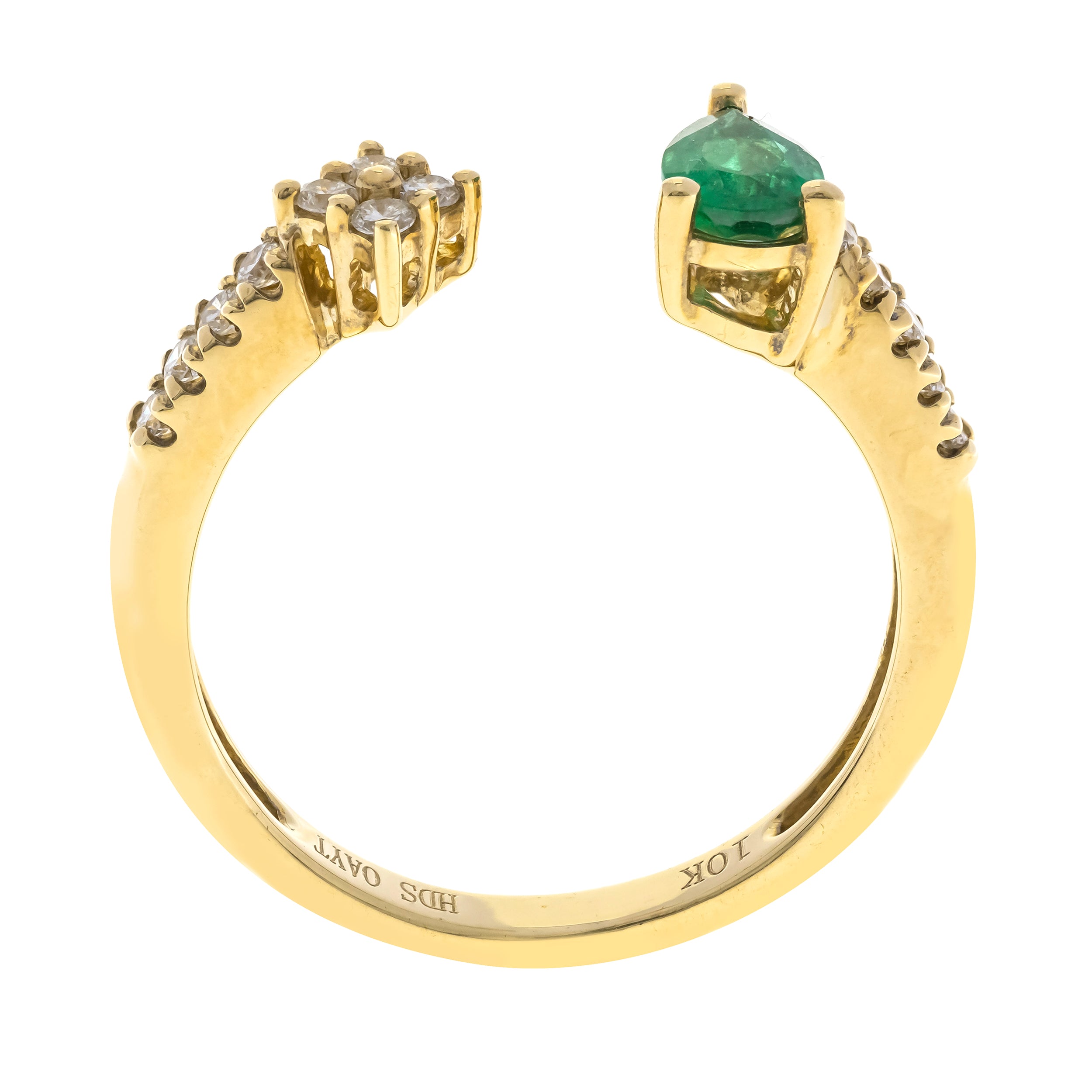 Decorate yourself in elegance with this Ring is crafted from 10-karat yellow gold Pear-Cut Emerald (1 pcs) 0.36 carat and Round-cut White Diamond (13 Pcs) 0.19 Carat. This Ring is weight 1.86 grams. This delicate Ring is polished to a high finish shine.