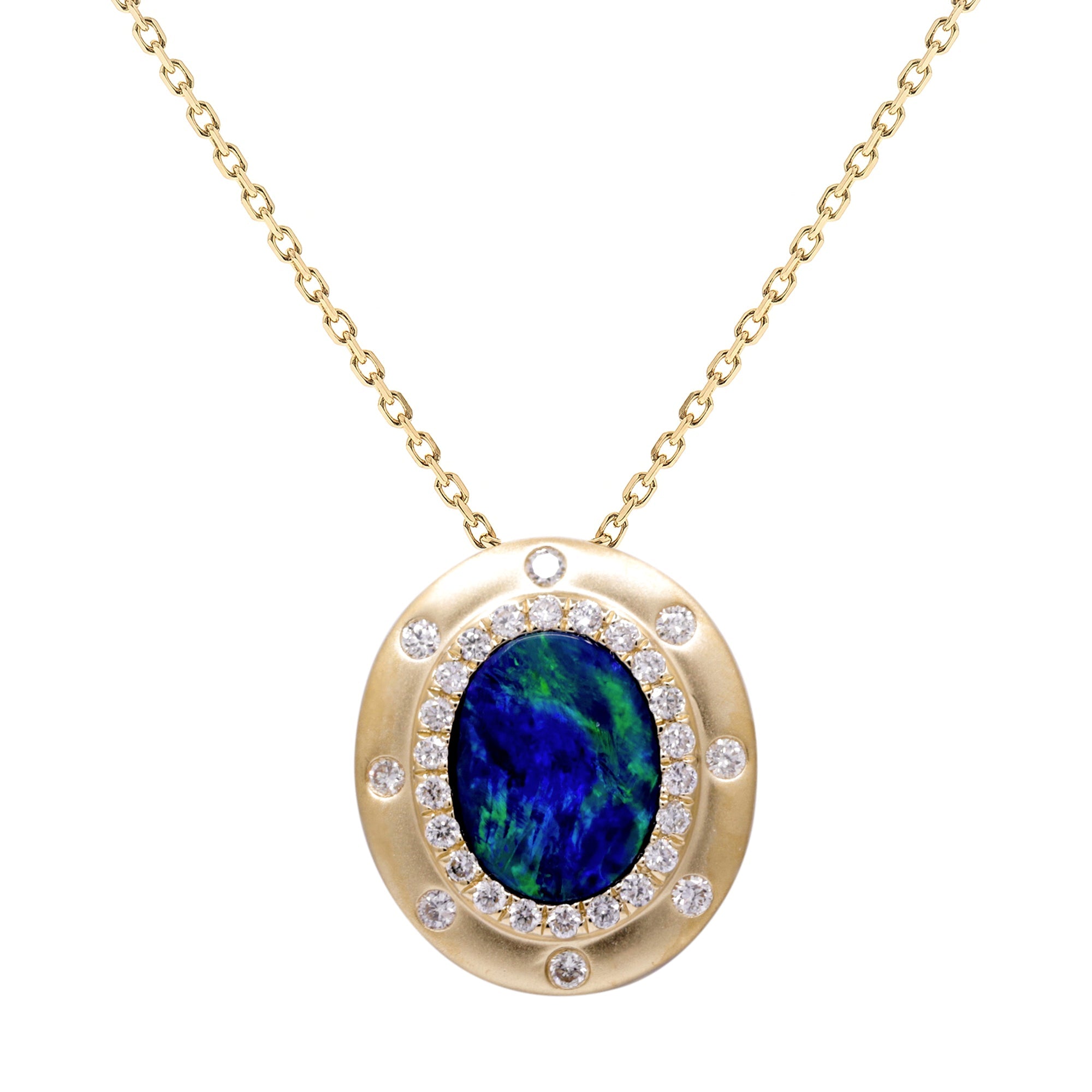 Ethereal and radiant, the Stellar Halo pendant draws inspiration from the wonders of the night sky. At its center lies a mesmerizing 7x9mm (1.1ct) oval-cut duplet opal, evoking the shifting colors of distant nebulae and celestial light. Encircling it are 30 brilliant white diamonds (0.24ct total), forming a luminous halo reminiscent of orbiting stars. Set in warm 14K yellow gold, this piece beautifully captures the awe of the cosmos—a perfect tribute to those who find meaning in the stars and elegance in the infinite.